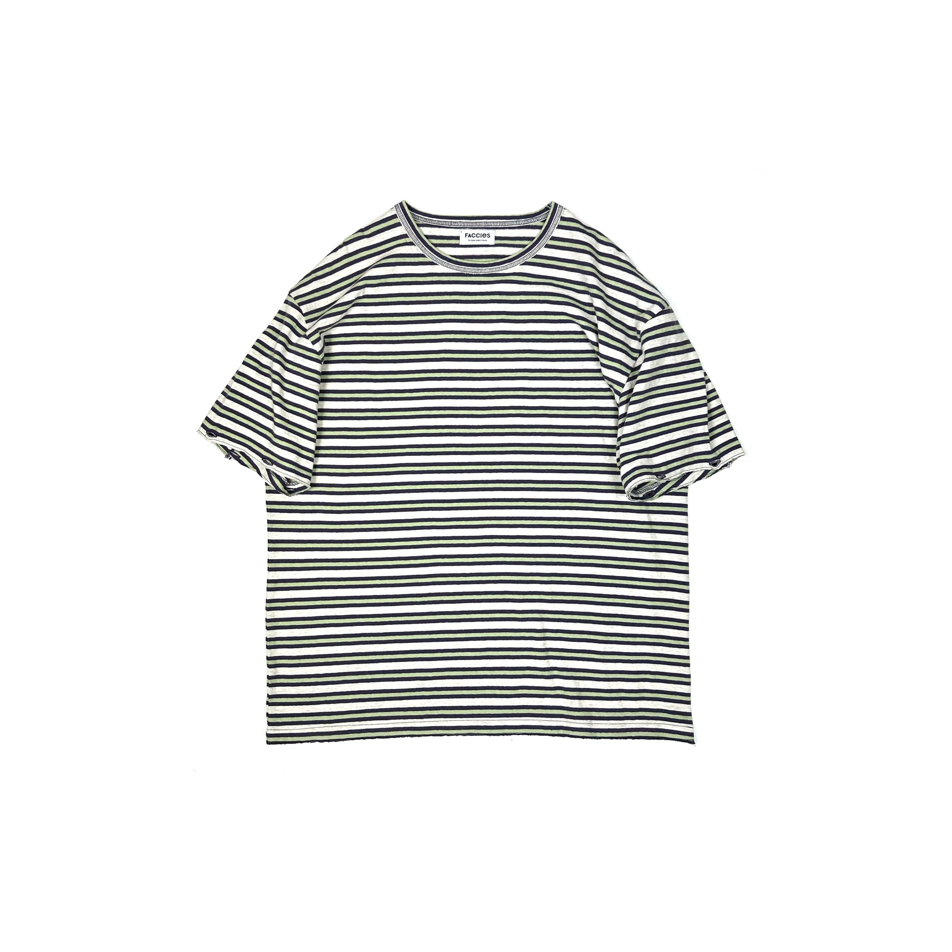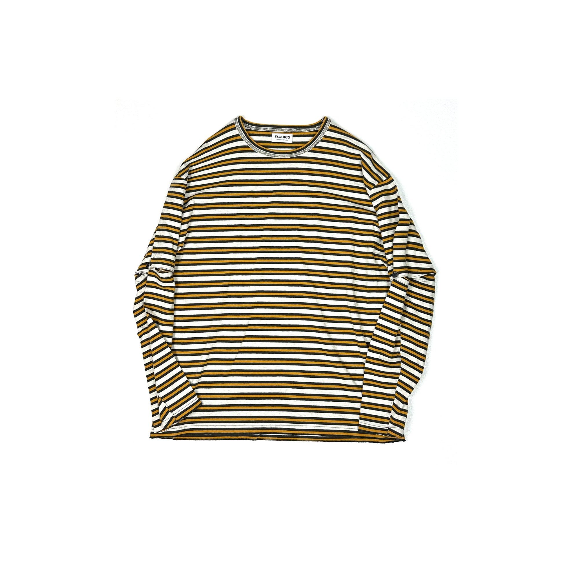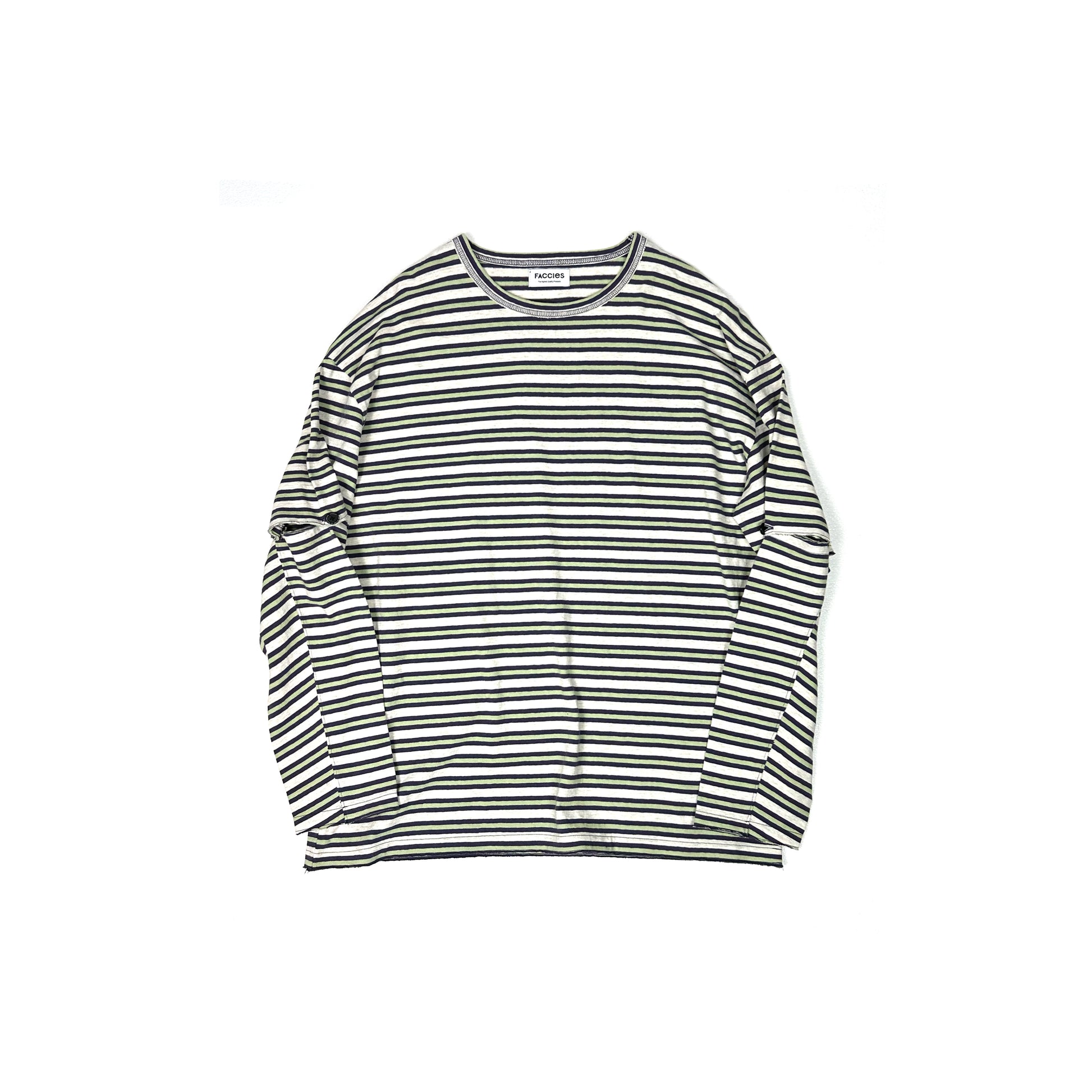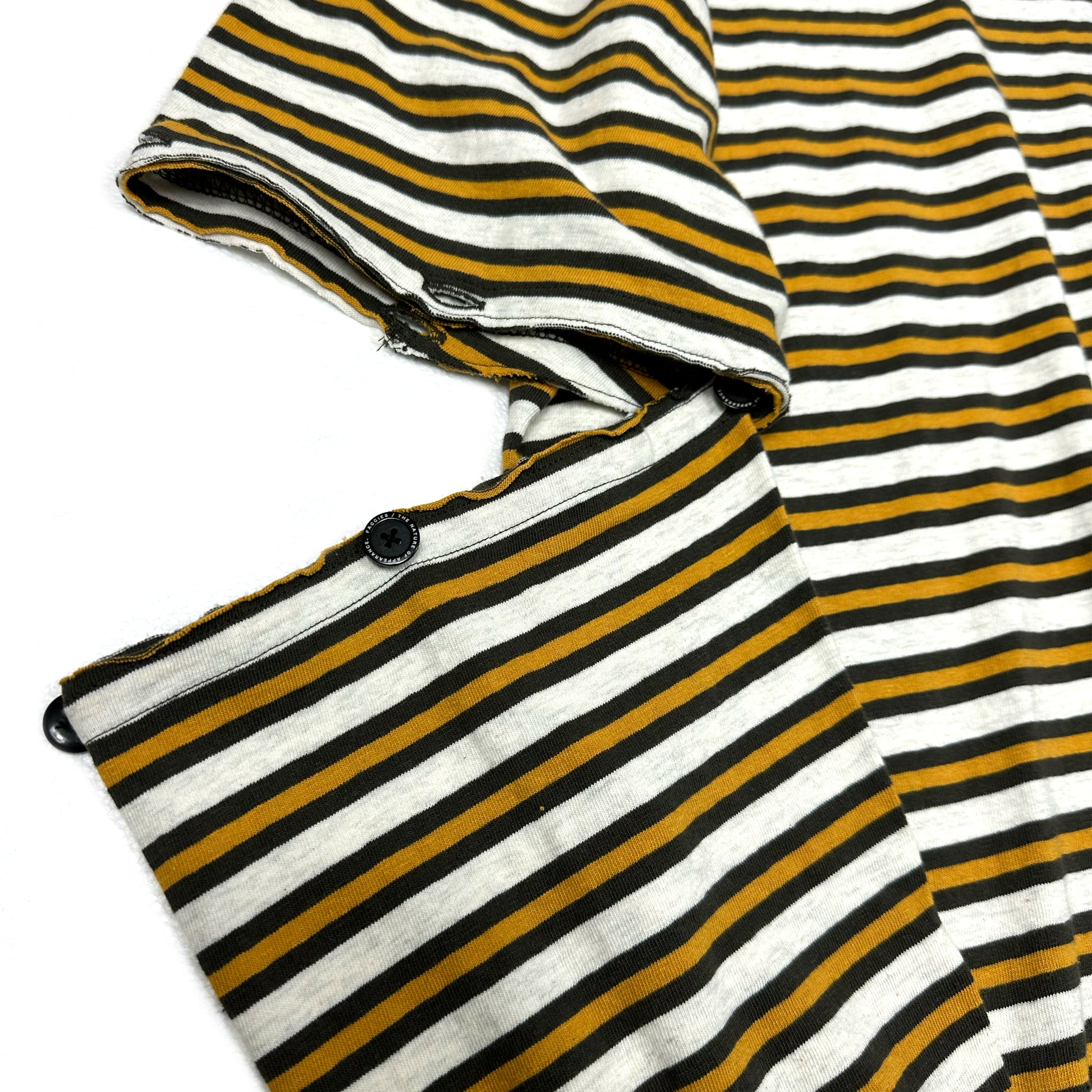 リサイクルコットンを使用した太番ムラ糸を使用して編み立てたボーダー生地。'90~00あたりのどこか懐かしい雰囲気を想わせるような配色に仕上げました。型は24SSから継続のFACCIES定番エルボーカットシリーズの袖脱着仕様。袖部分がボタンにより脱着可能な仕様になり半袖、⻑袖として楽しめるようになっている。このシリーズはALLシーズン使用できる企画になっている