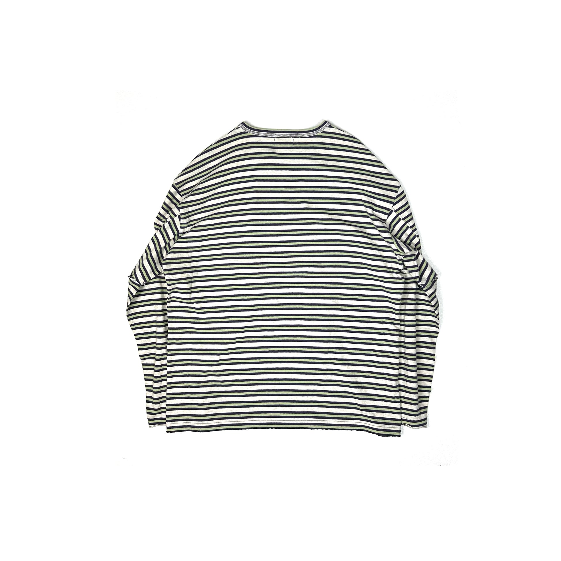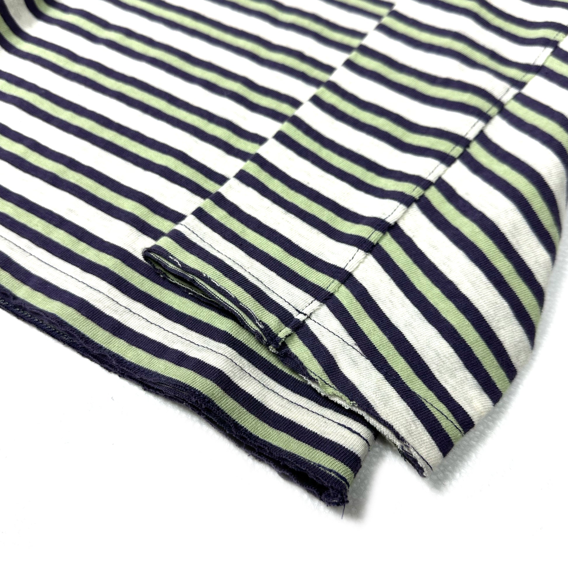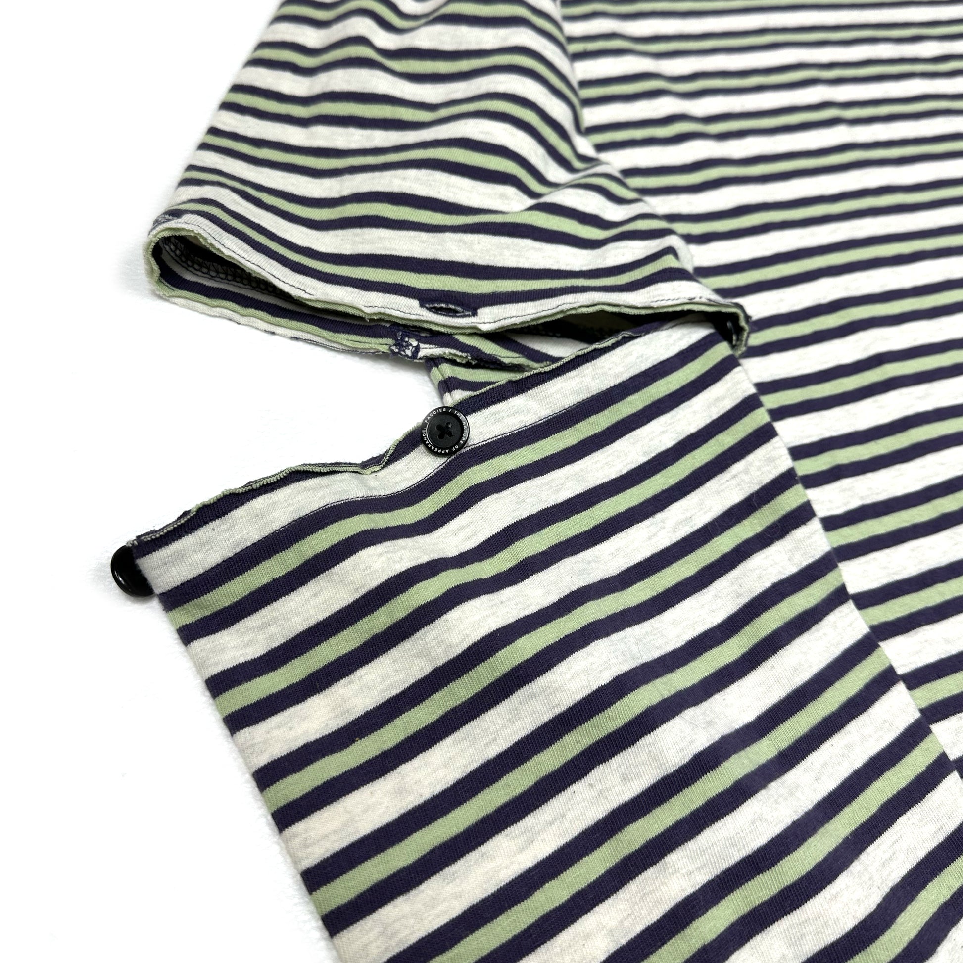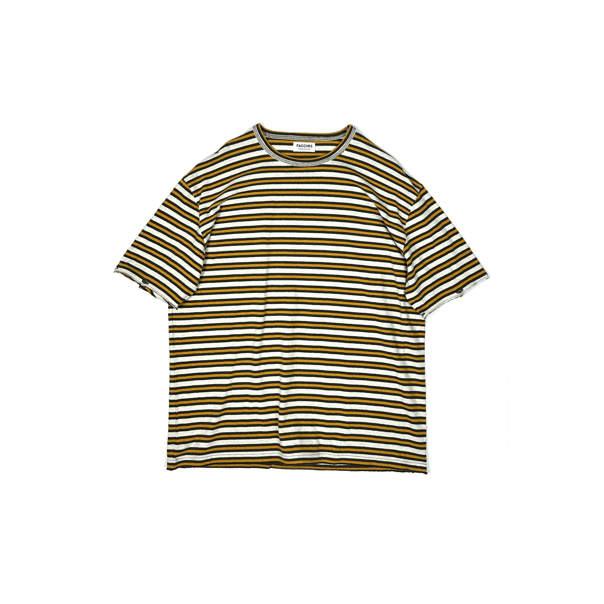 リサイクルコットンを使用した太番ムラ糸を使用して編み立てたボーダー生地。'90~00あたりのどこか懐かしい雰囲気を想わせるような配色に仕上げました。型は24SSから継続のFACCIES定番エルボーカットシリーズの袖脱着仕様。袖部分がボタンにより脱着可能な仕様になり半袖、⻑袖として楽しめるようになっている。このシリーズはALLシーズン使用できる企画になっている