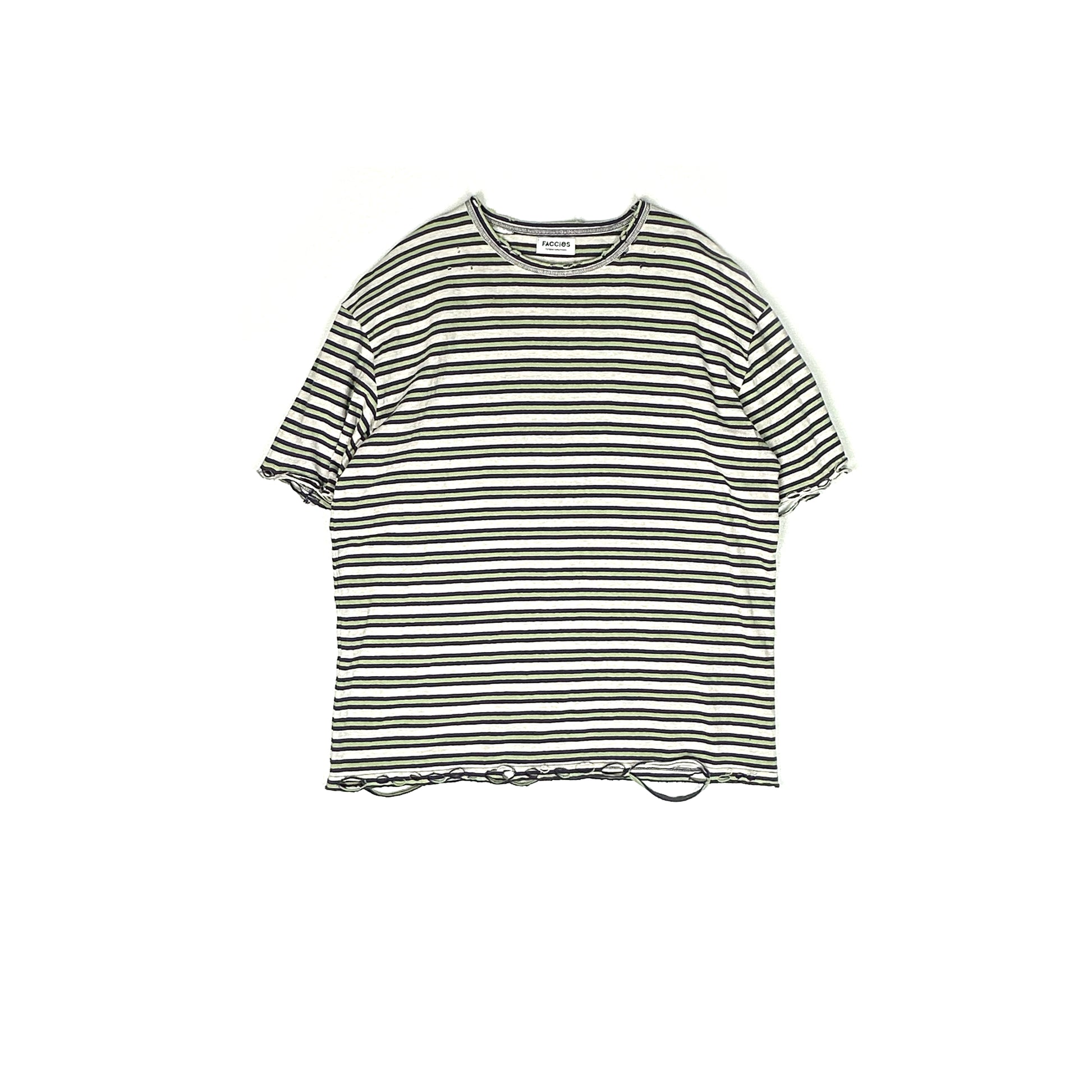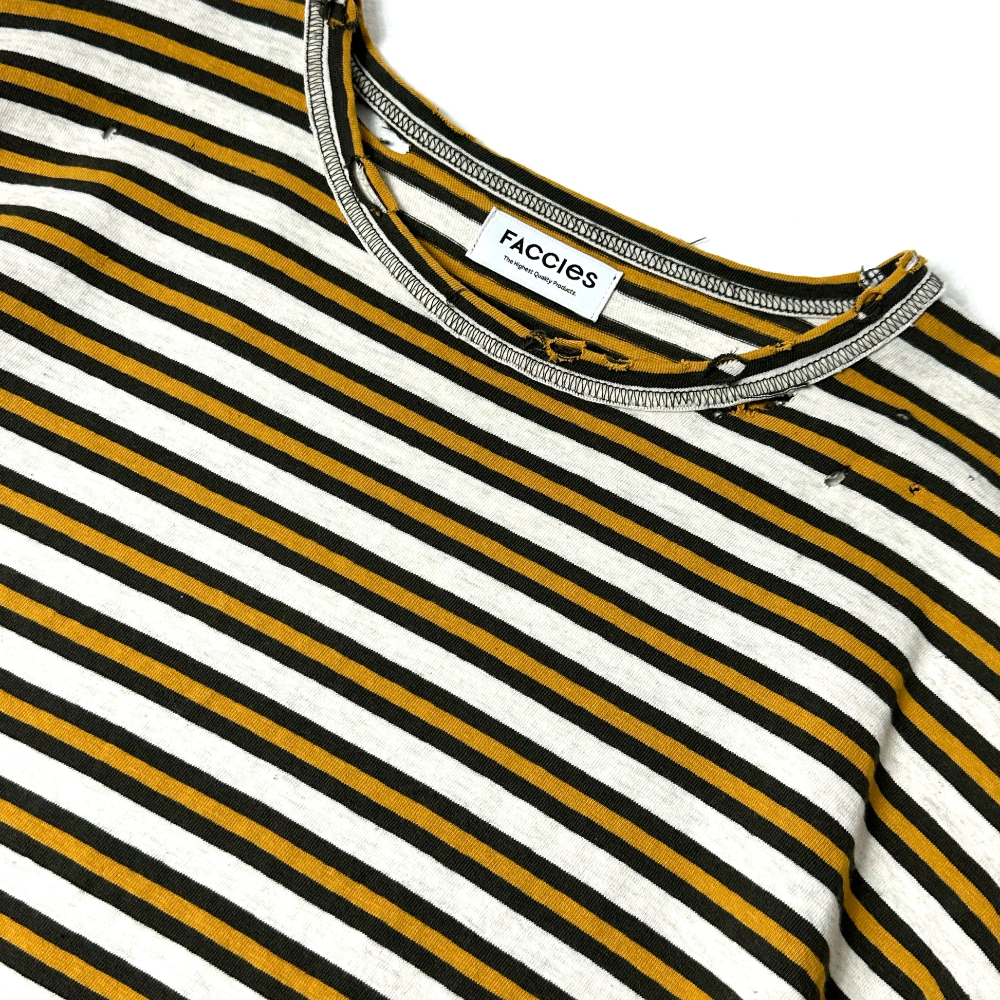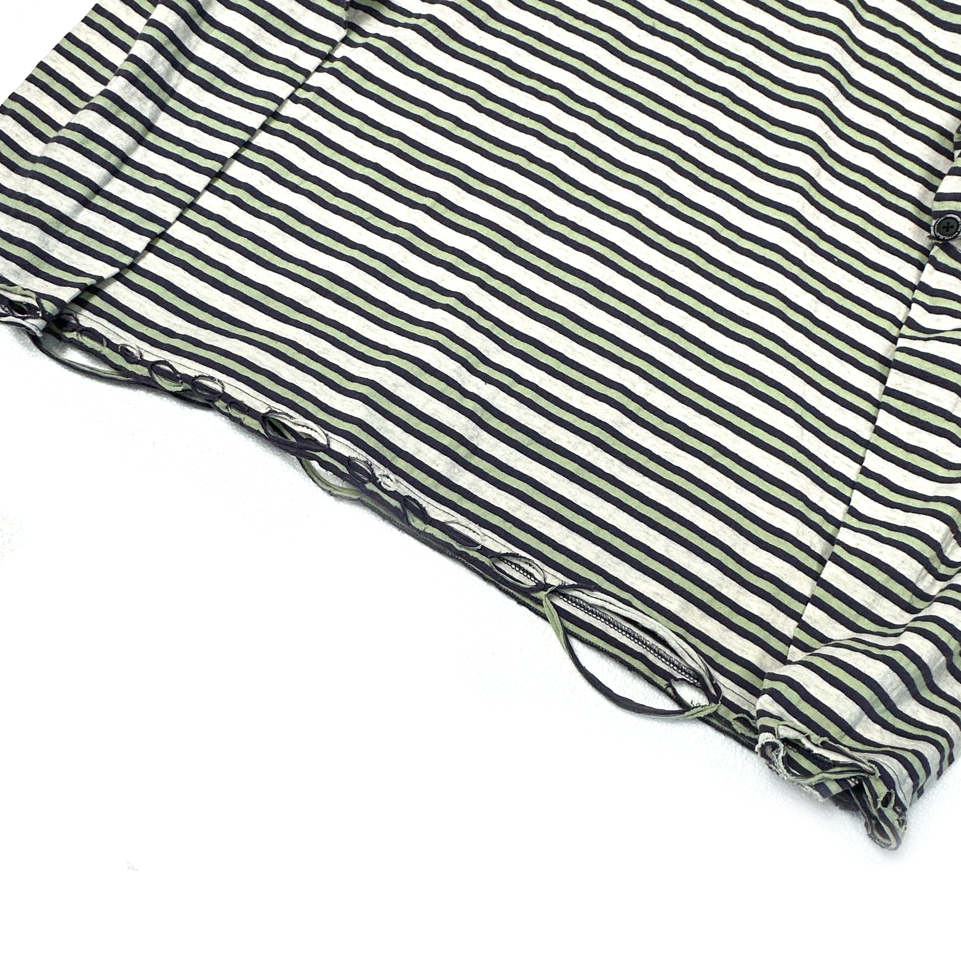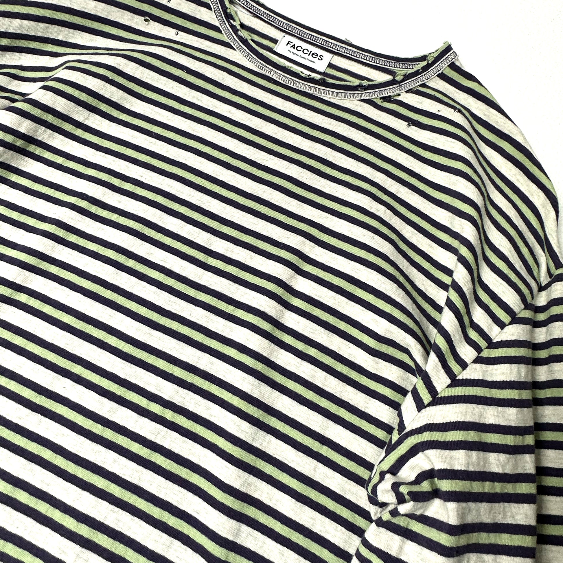 リサイクルコットンを使用した太番ムラ糸を使用して編み立てたボーダー生地。'90~00あたりのどこか懐かしい雰囲気を想わせるような配色に仕上げました。型は24SSから継続のFACCIES定番エルボーカットシリーズの袖脱着仕様。袖部分がボタンにより脱着可能な仕様になり半袖、⻑袖として楽しめるようになっている。こちらの品番は02001-1の型に1点1点手業でダメージを入れたアイテムになります。自分自身が着用したいと思える強すぎない程よいボロ感を表現した品番。このシリーズはALLシーズン使用できる企画になっている。