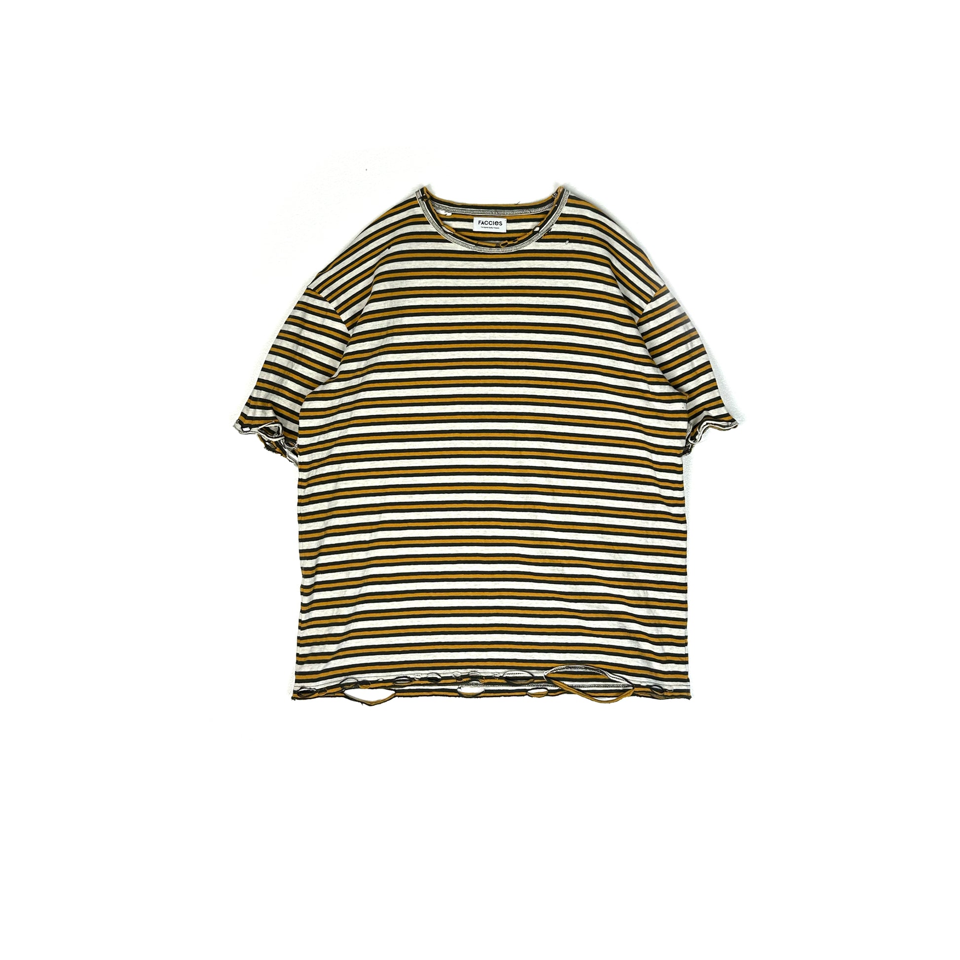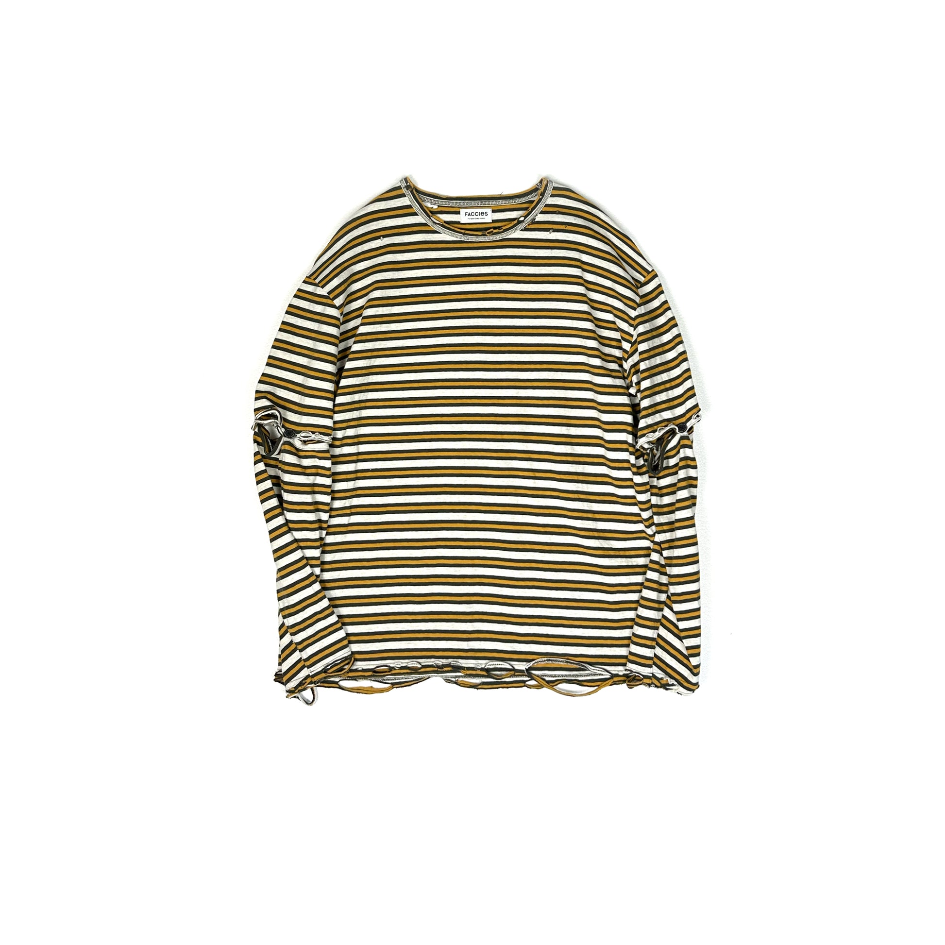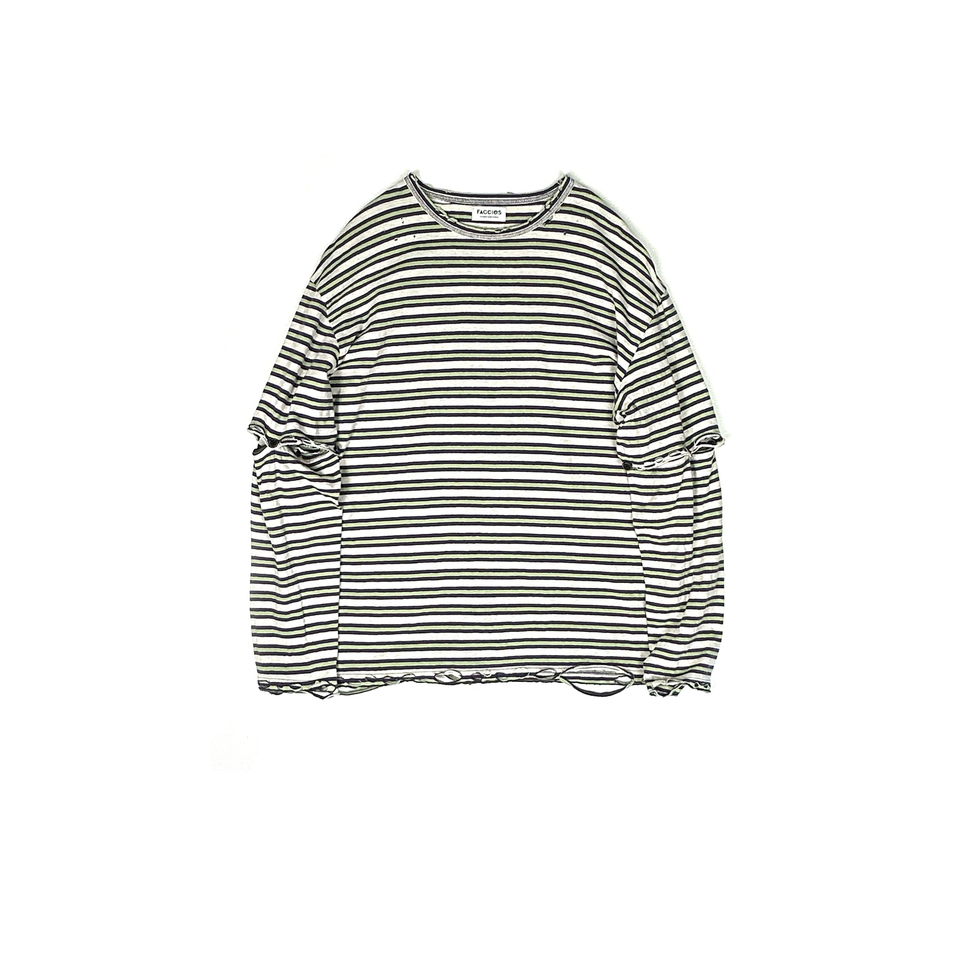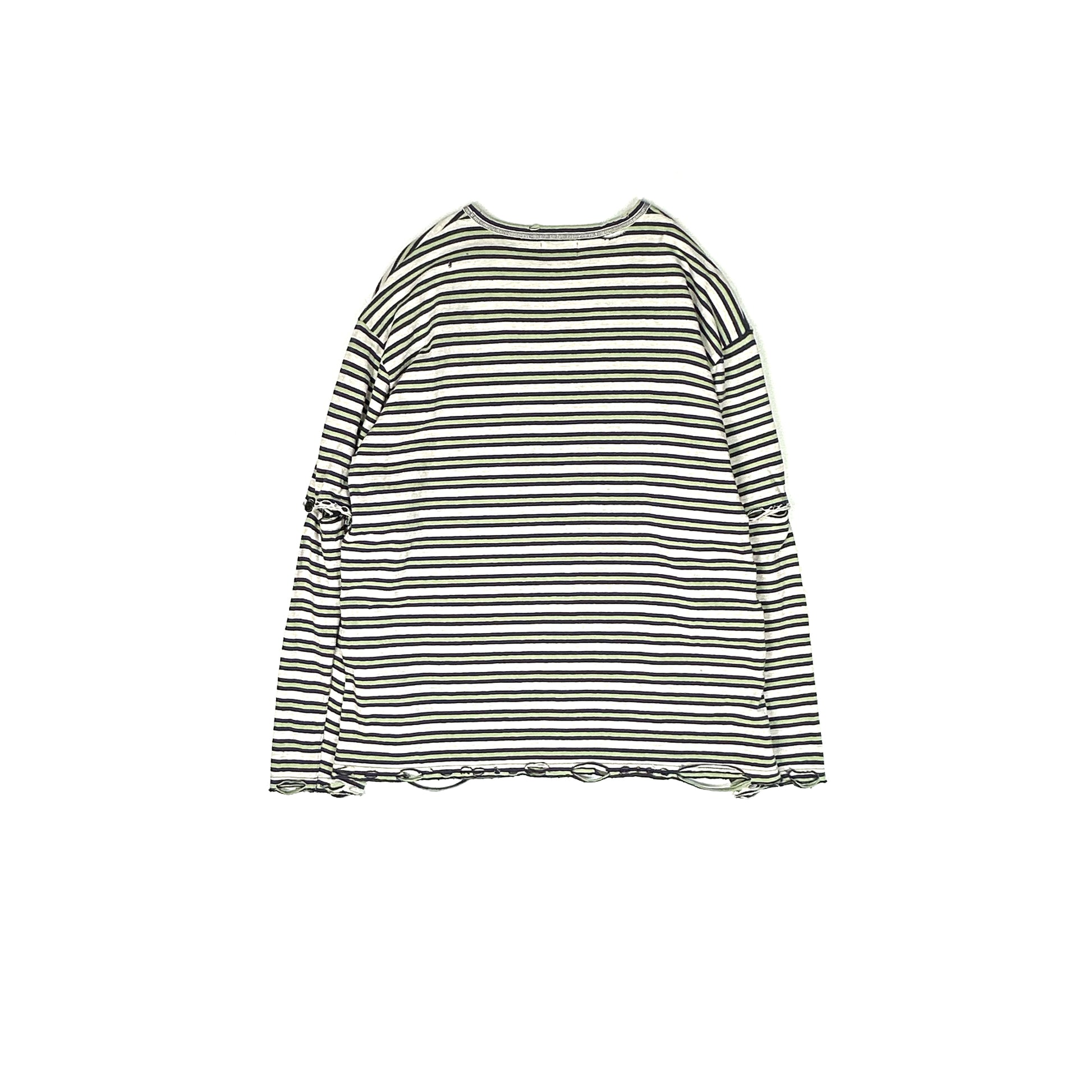 リサイクルコットンを使用した太番ムラ糸を使用して編み立てたボーダー生地。'90~00あたりのどこか懐かしい雰囲気を想わせるような配色に仕上げました。型は24SSから継続のFACCIES定番エルボーカットシリーズの袖脱着仕様。袖部分がボタンにより脱着可能な仕様になり半袖、⻑袖として楽しめるようになっている。こちらの品番は02001-1の型に1点1点手業でダメージを入れたアイテムになります。自分自身が着用したいと思える強すぎない程よいボロ感を表現した品番。このシリーズはALLシーズン使用できる企画になっている。