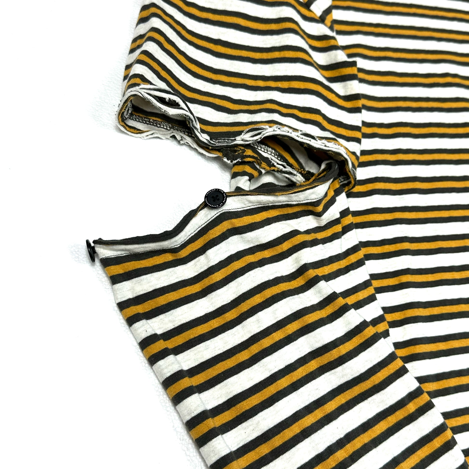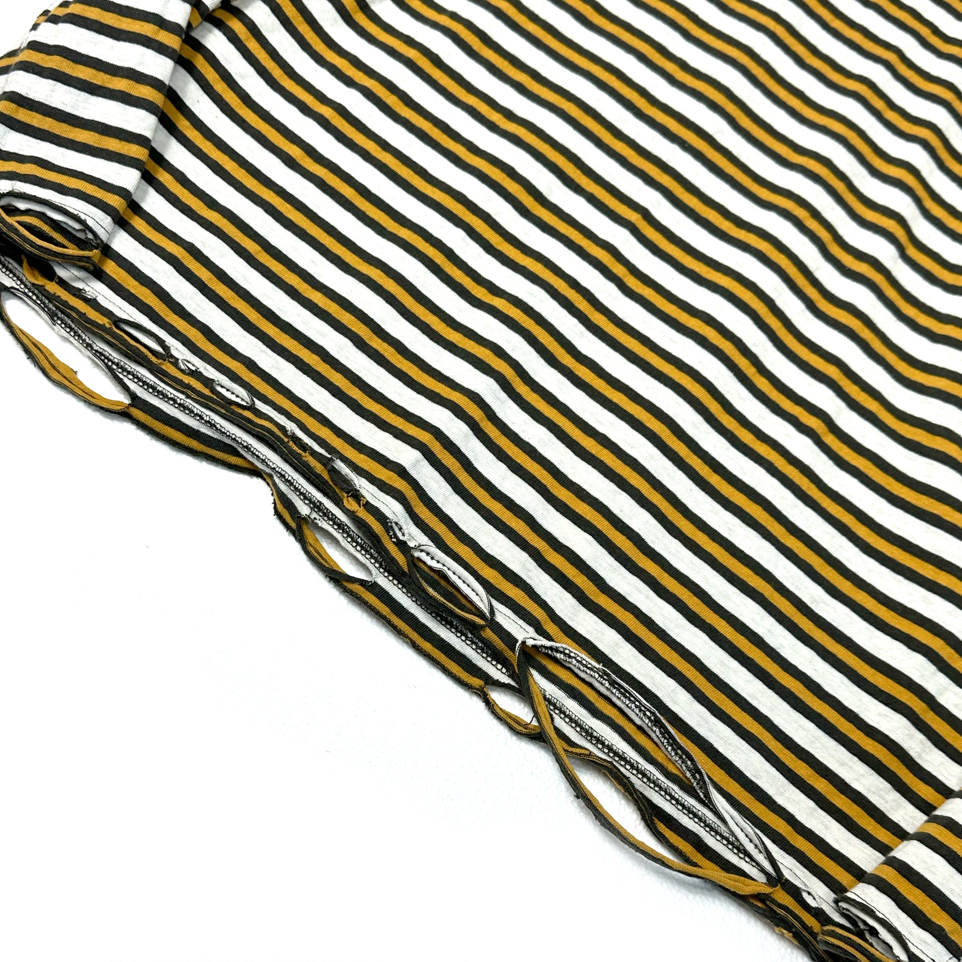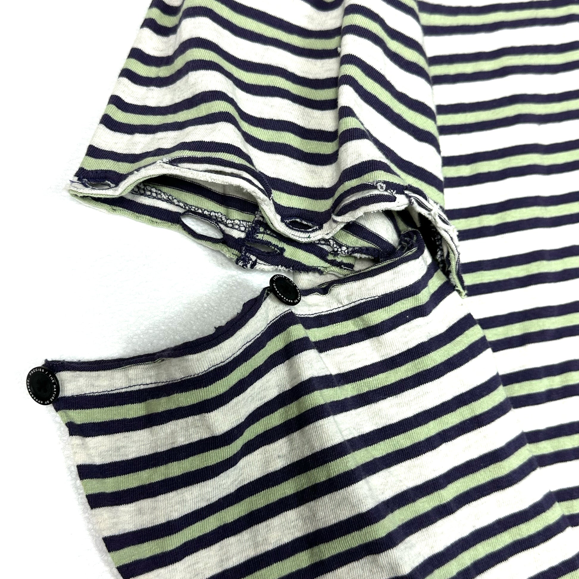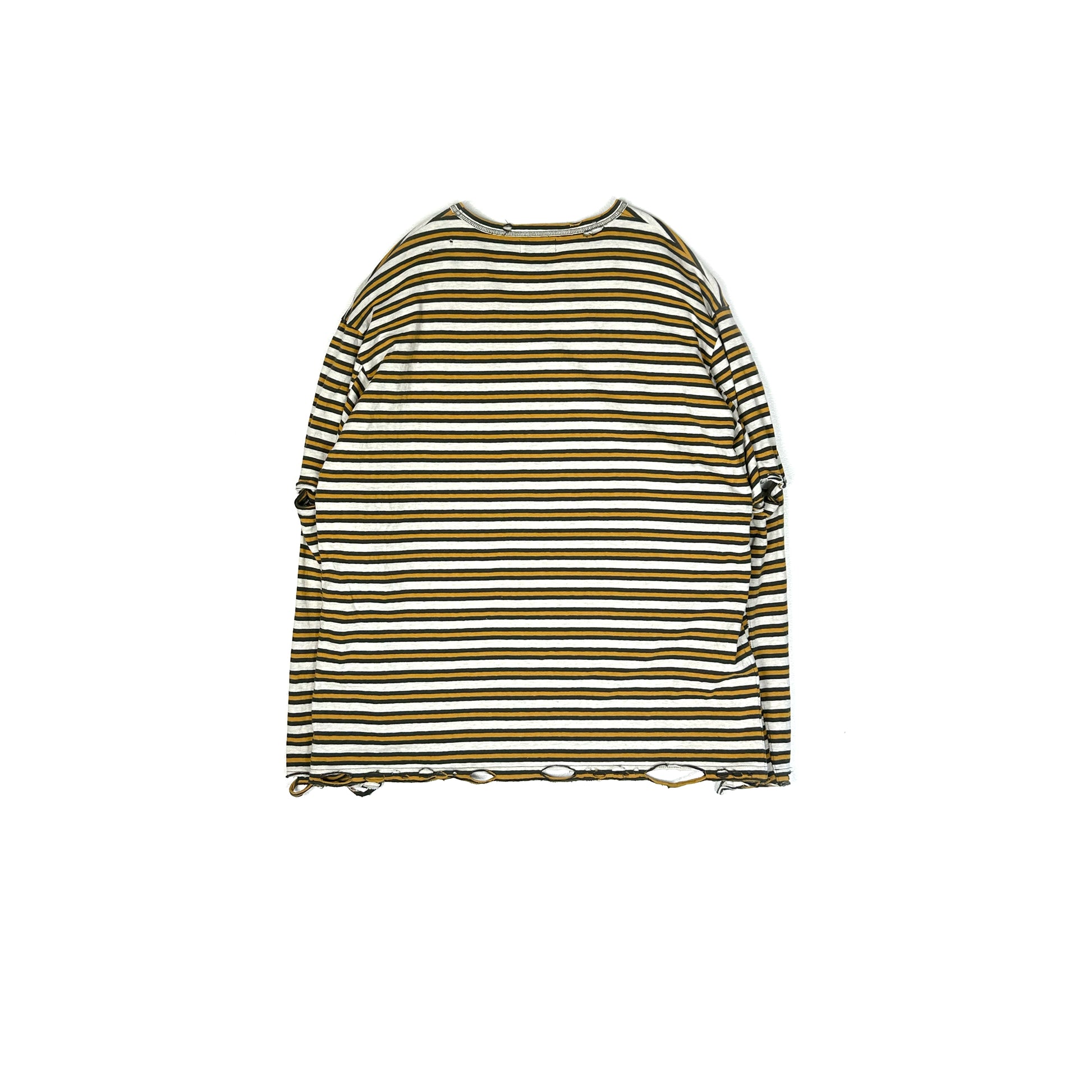 リサイクルコットンを使用した太番ムラ糸を使用して編み立てたボーダー生地。'90~00あたりのどこか懐かしい雰囲気を想わせるような配色に仕上げました。型は24SSから継続のFACCIES定番エルボーカットシリーズの袖脱着仕様。袖部分がボタンにより脱着可能な仕様になり半袖、⻑袖として楽しめるようになっている。こちらの品番は02001-1の型に1点1点手業でダメージを入れたアイテムになります。自分自身が着用したいと思える強すぎない程よいボロ感を表現した品番。このシリーズはALLシーズン使用できる企画になっている。