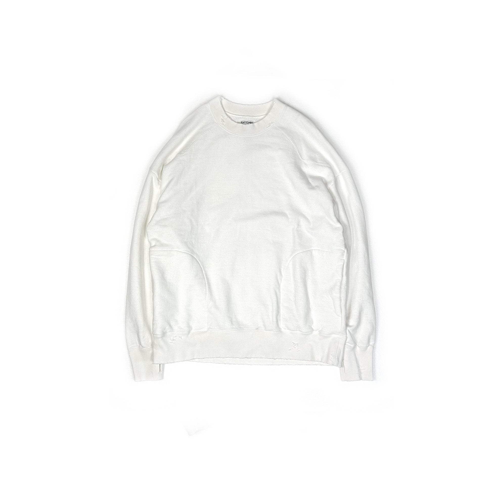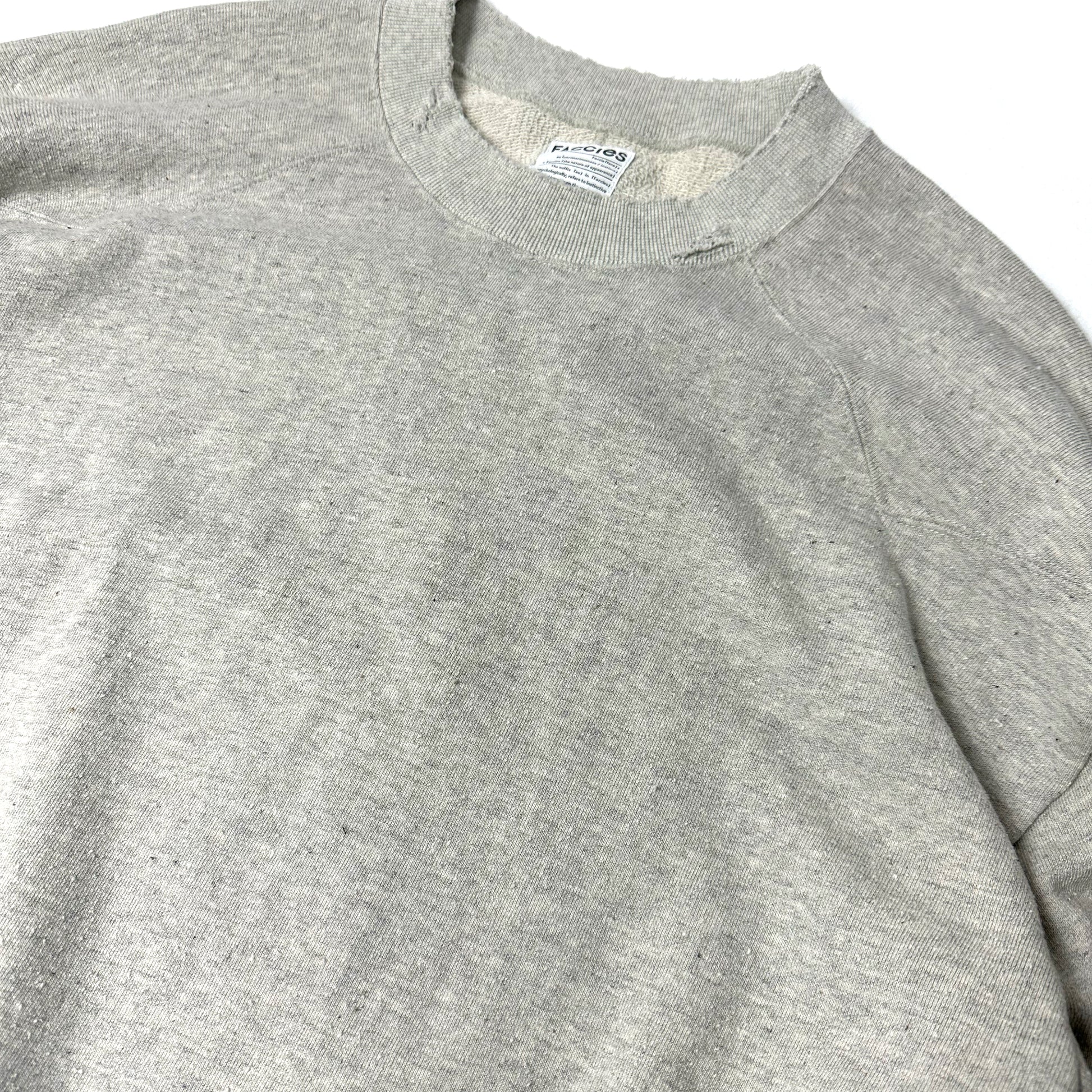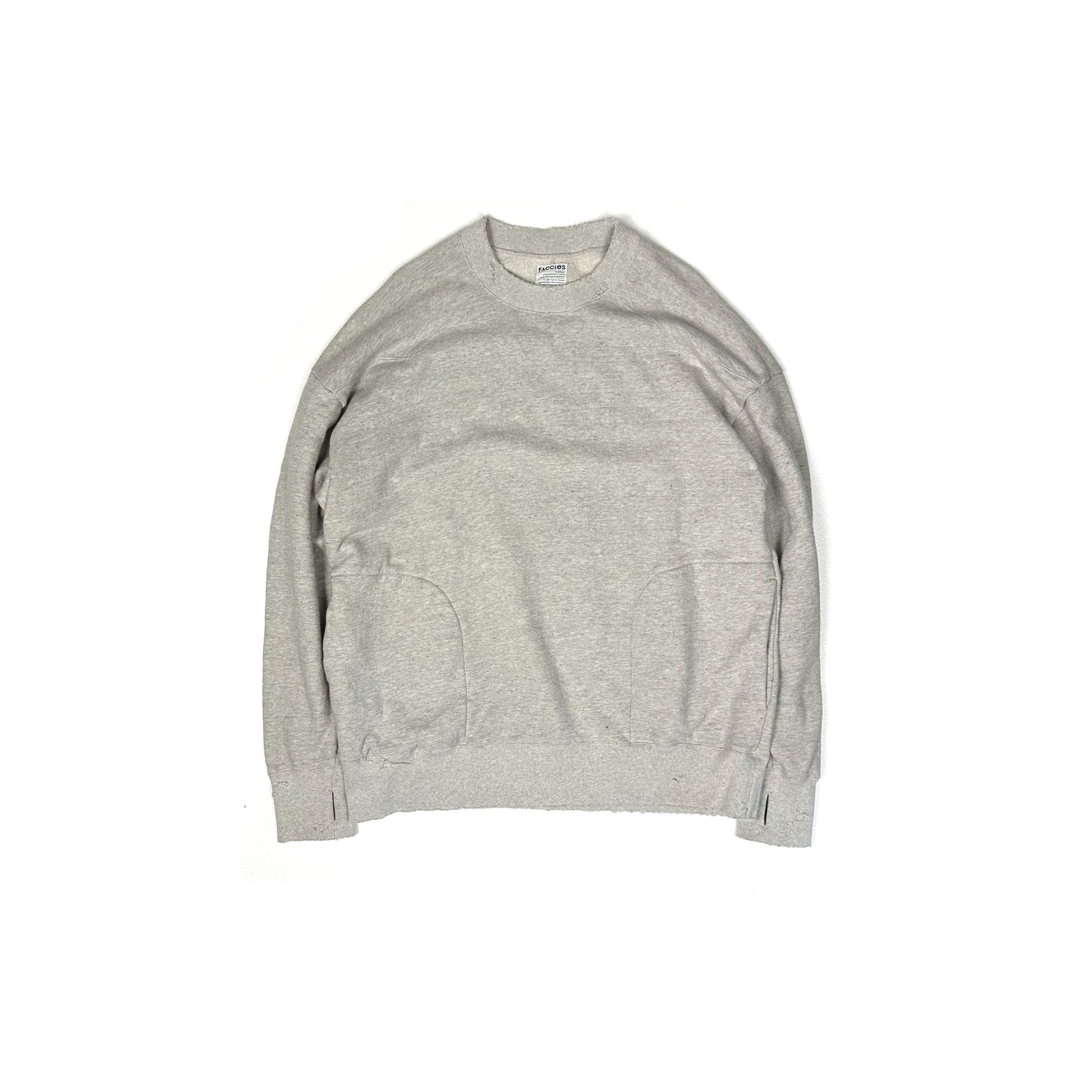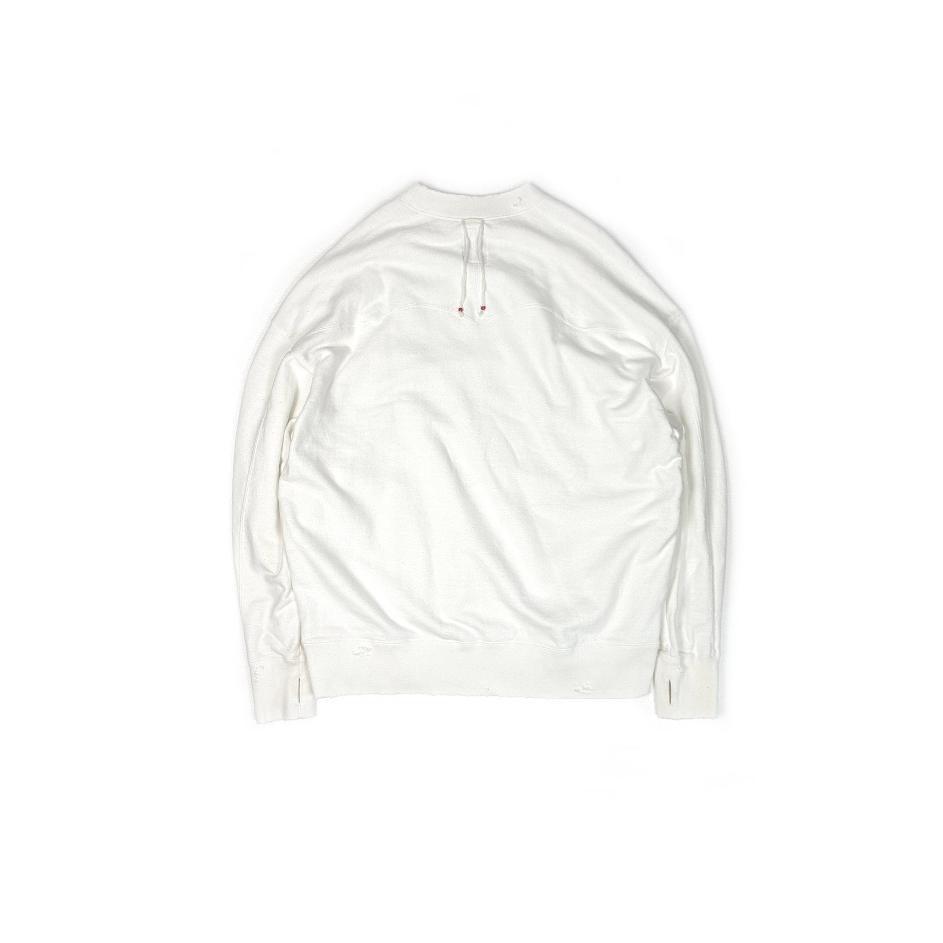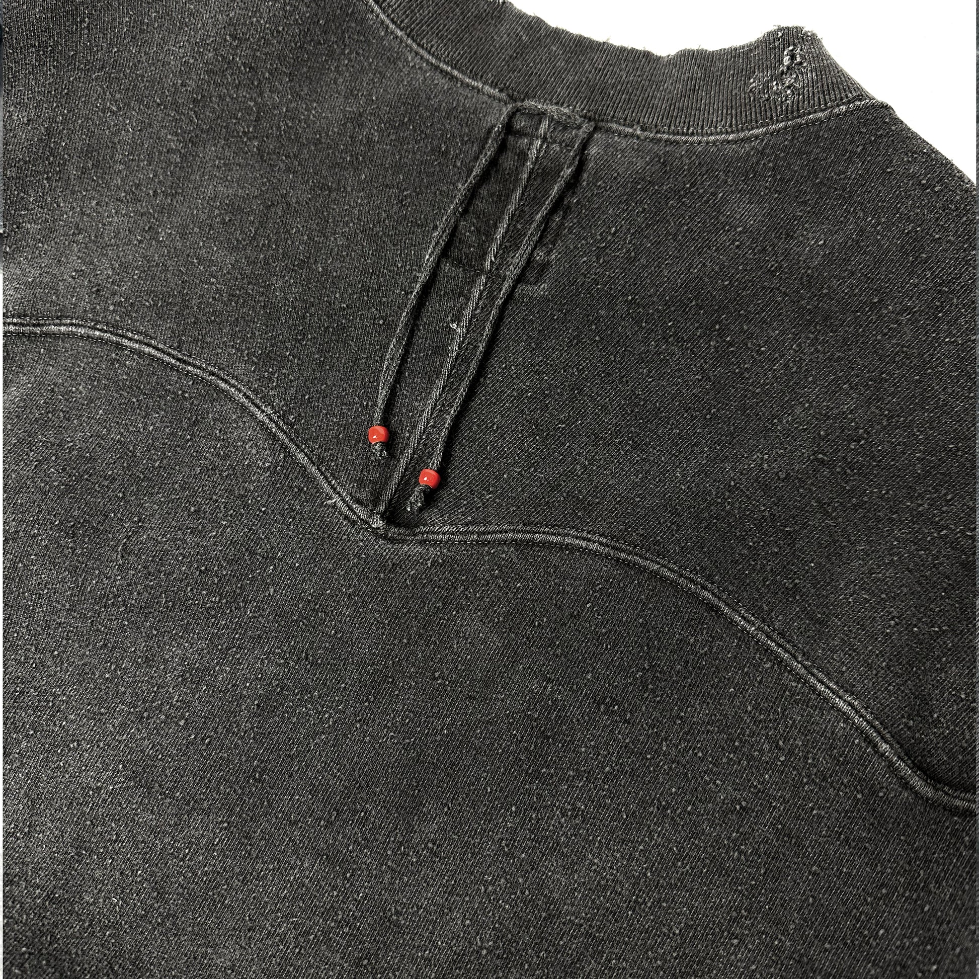 素材には生地屋が独自に開発したデニムの大戦モデルと呼ばれる当時の糸を再現した糸を使用。当時の大戦モデルは時代背景もありムラが強くザラ感もある上品な生地とは真逆の生地であった。それから年月を経てあえてそれがかっこいいとされるロマンス。自分は綺麗な質感や生地も好きなのだがやはり癖のある男っぽい生地、経年変化した生地にトキメキと想像を感じてしまう。そんな今回の綿のフシやネップがある癖のある糸を使用し裏毛生地作成。独特のタッチ感と着古した感じがとても良く1点1点手作業にて雰囲気に合わせた箇所にダメージを入れBLACKは製品加工を施し更に雰囲気をプラス。どのカラーも着込んでいってさらにエイジングを楽しんでほしいと企画した品番になります。シルエットはドロップショルダー型。肩と後身にはFACCIESのアイコンのウエスタン調のヨークのデザインが入っている。肩のハギ合わせを無くし着用時にシルエットを綺麗に見せれるよう設計。後ろの衿元にはインディアンジュエリーでよく使用されているホワイトハーツのビーズがアクセントととしてついている。