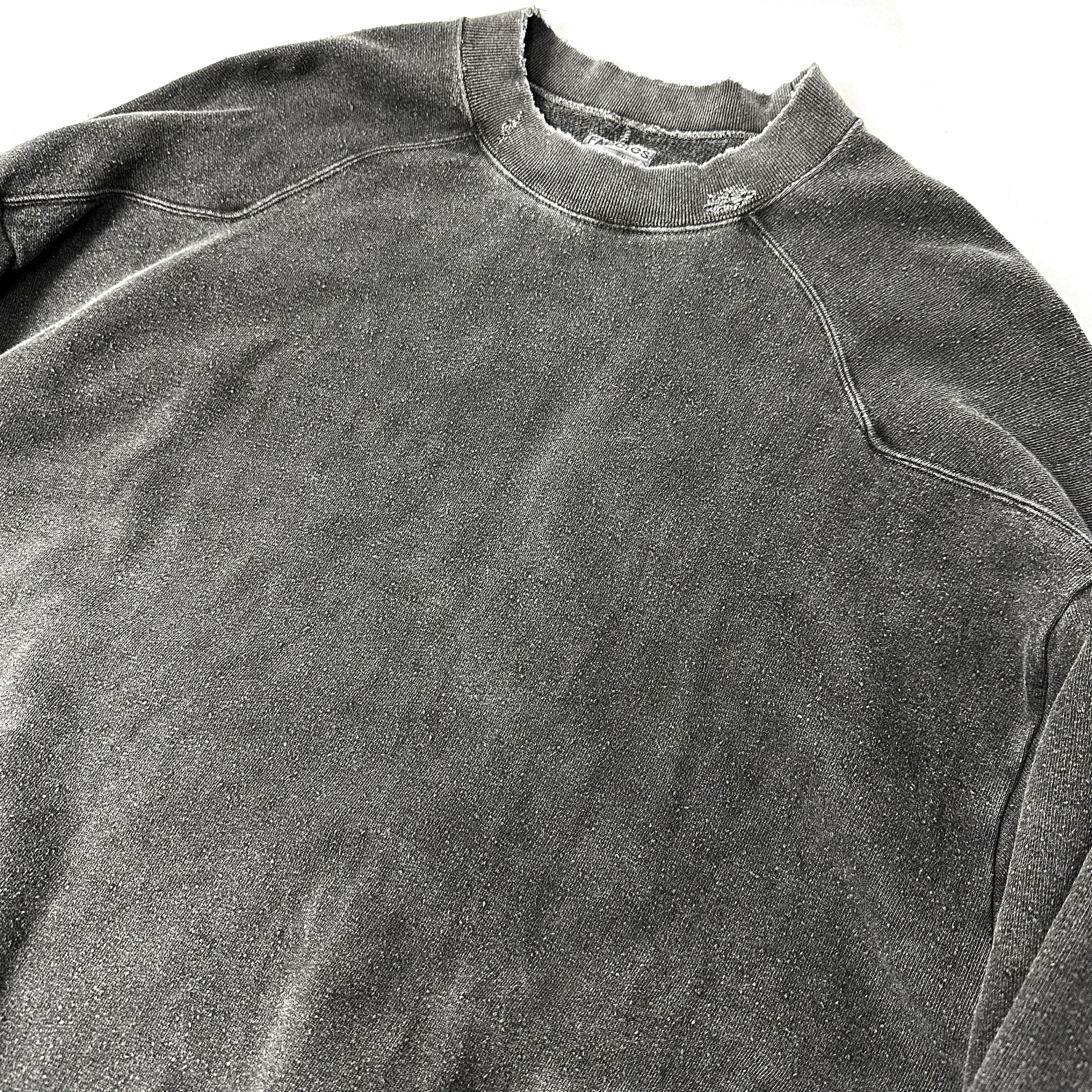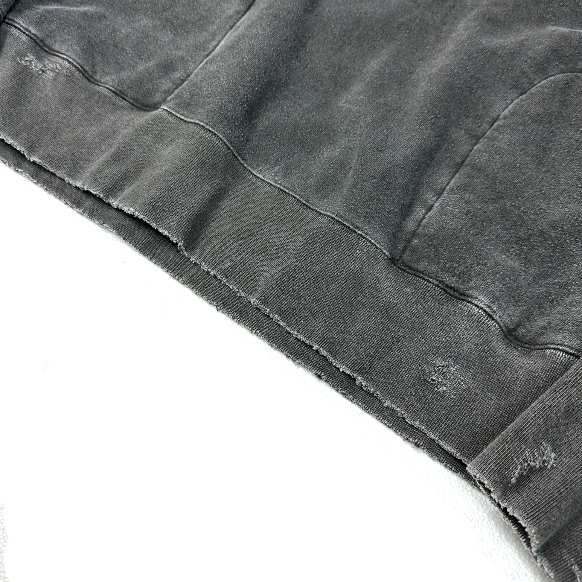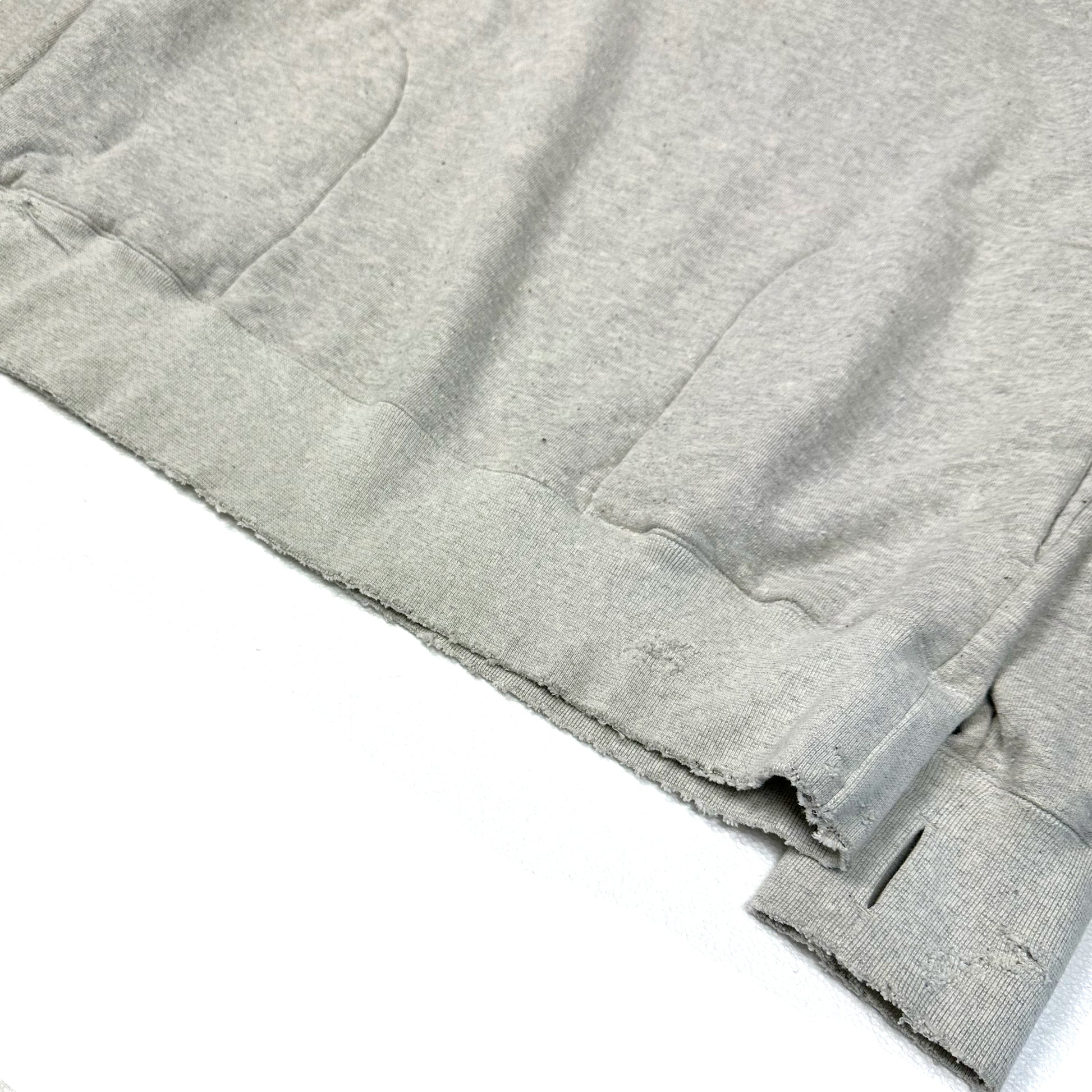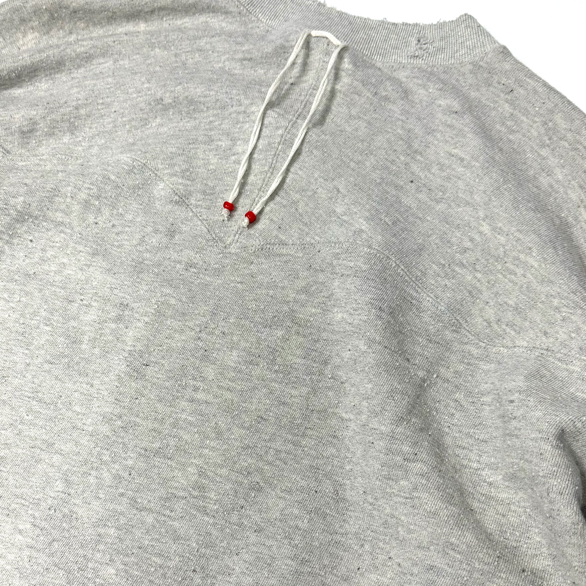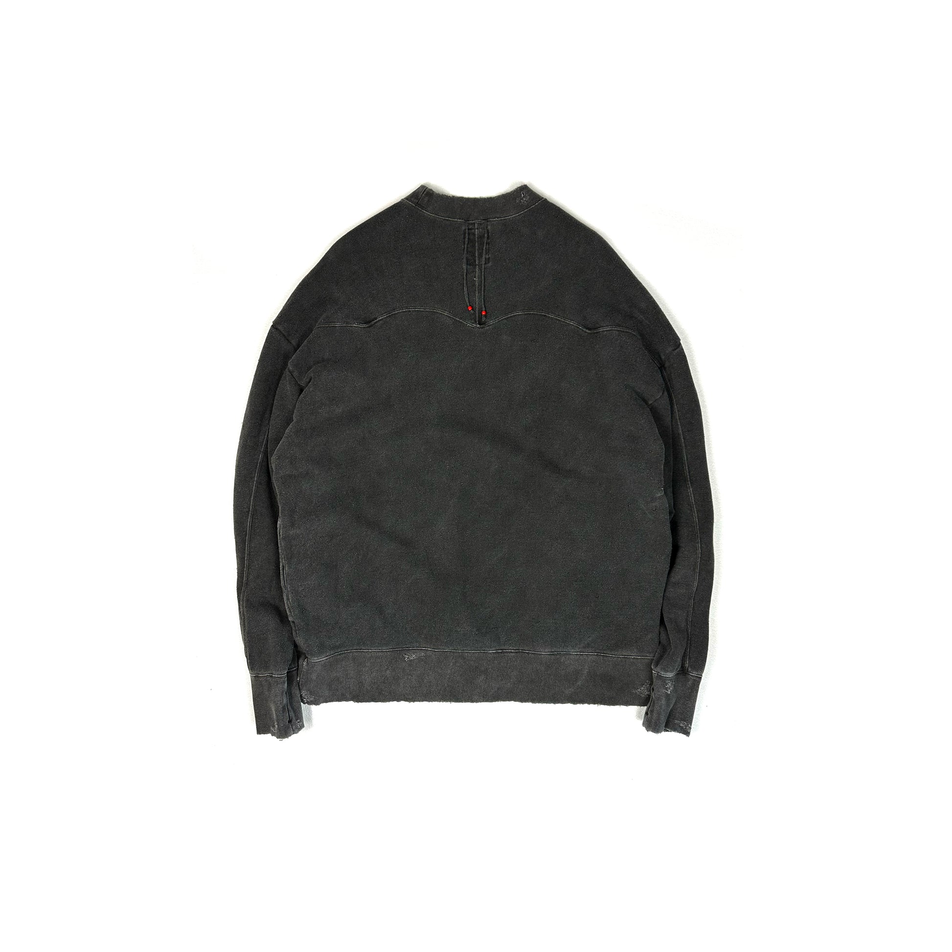 素材には生地屋が独自に開発したデニムの大戦モデルと呼ばれる当時の糸を再現した糸を使用。当時の大戦モデルは時代背景もありムラが強くザラ感もある上品な生地とは真逆の生地であった。それから年月を経てあえてそれがかっこいいとされるロマンス。自分は綺麗な質感や生地も好きなのだがやはり癖のある男っぽい生地、経年変化した生地にトキメキと想像を感じてしまう。そんな今回の綿のフシやネップがある癖のある糸を使用し裏毛生地作成。独特のタッチ感と着古した感じがとても良く1点1点手作業にて雰囲気に合わせた箇所にダメージを入れBLACKは製品加工を施し更に雰囲気をプラス。どのカラーも着込んでいってさらにエイジングを楽しんでほしいと企画した品番になります。シルエットはドロップショルダー型。肩と後身にはFACCIESのアイコンのウエスタン調のヨークのデザインが入っている。肩のハギ合わせを無くし着用時にシルエットを綺麗に見せれるよう設計。後ろの衿元にはインディアンジュエリーでよく使用されているホワイトハーツのビーズがアクセントととしてついている。