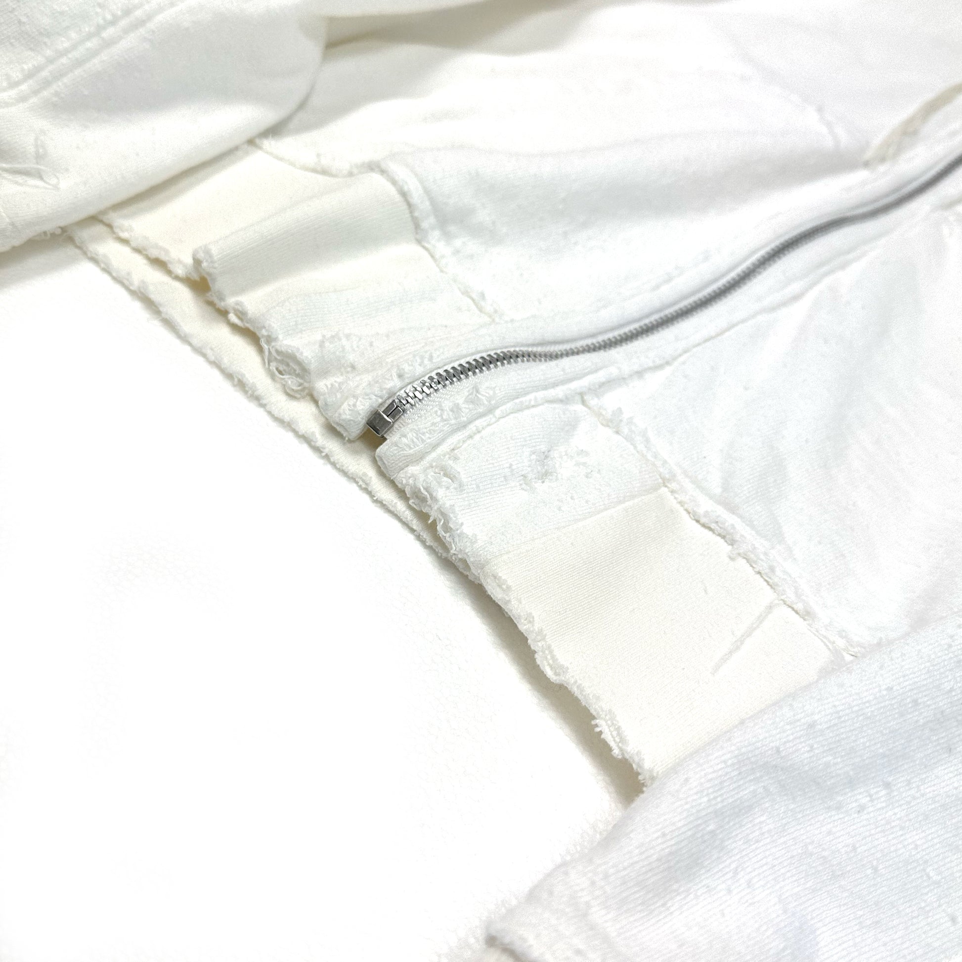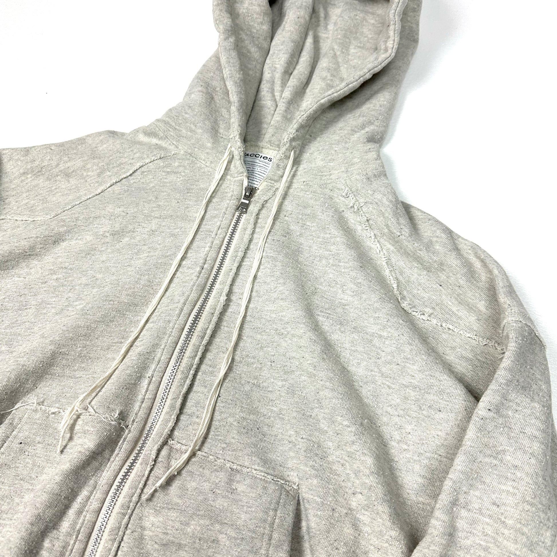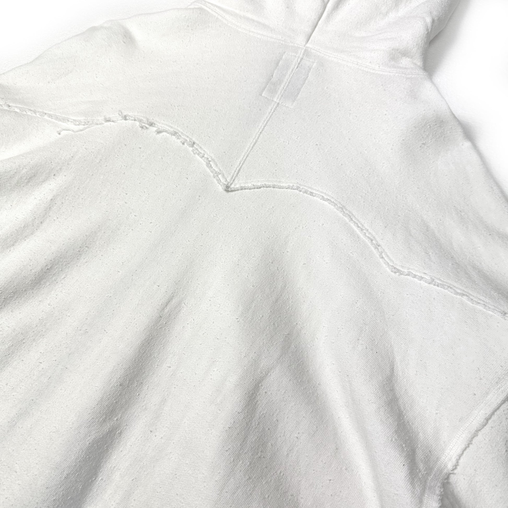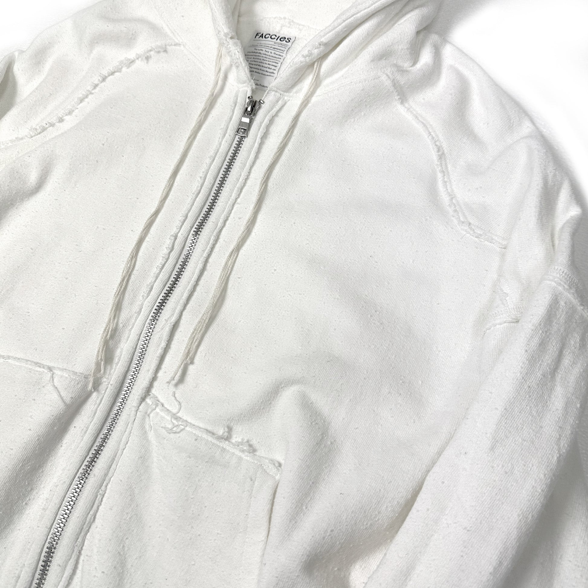 素材には生地屋が独自に開発したデニムの大戦モデルと呼ばれる当時の糸を再現した糸を使用。当時の大戦モデルは時代背景もありムラが強くザラ感もある上品な生地とは真逆の生地であった。それから年月を経てあえてそれがかっこいいとされるロマンス。自分は綺麗な質感や生地も好きなのだがやはり癖のある男っぽい生地、経年変化した生地にトキメキと想像を感じてしまう。そんな今回の綿のフシやネップがある癖のある糸を使用し裏毛生地作成。独特のタッチ感と着古した感じがとても良く1点1点手作業にて雰囲気に合わせた箇所にダメージを入れBLACKは製品加工を施し更に雰囲気をプラス。どのカラーも着込んでいってさらにエイジングを楽しんでほしいと企画した品番になります。シルエットはやや着丈をショート丈にしたフーディータイプ。肩と後身にはFACCIESのアイコンのウエスタン調のヨークのデザインが入っている。肩のハギ合わせを無くし着用時にシルエットを綺麗に見せれるよう設計。ファスナーにはWALDESのビンテージファスナーを使用。