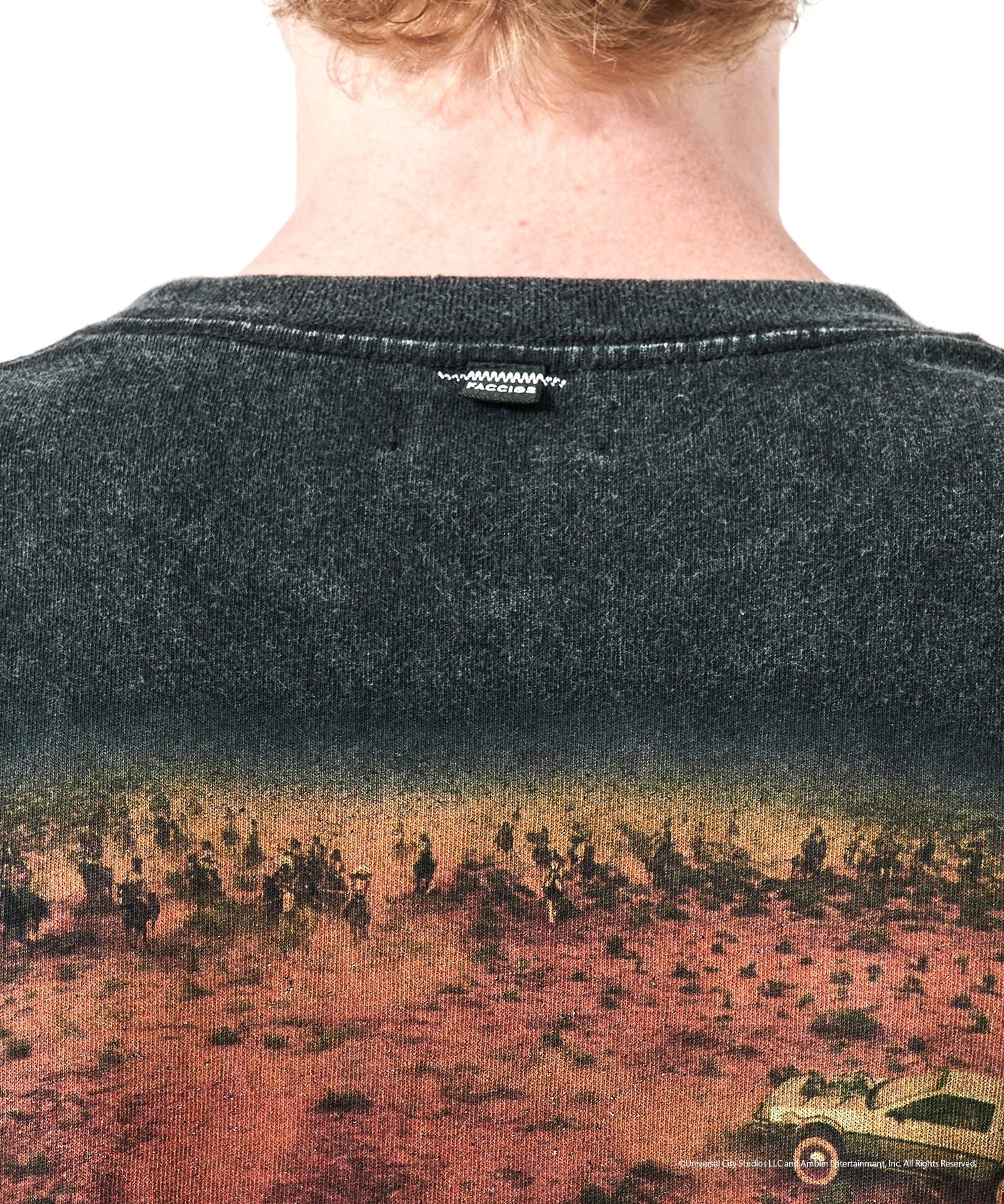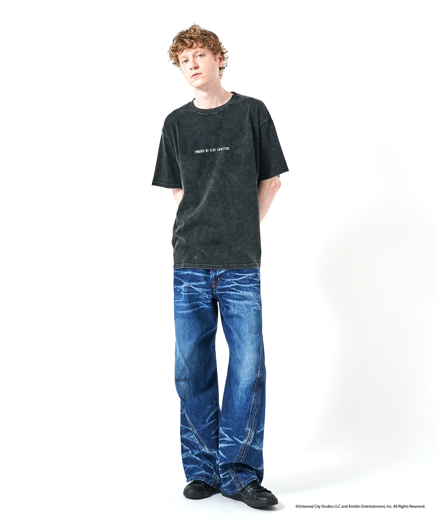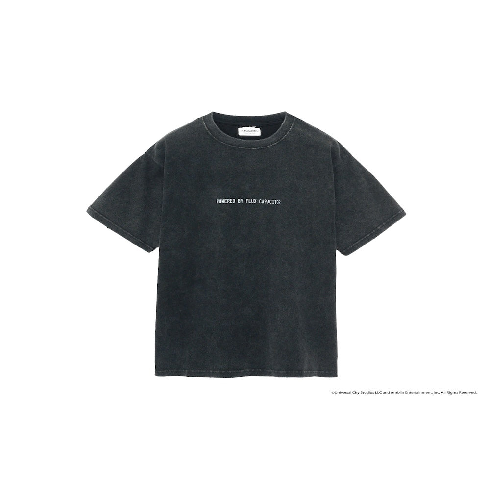 FACCIESとSTUDIOUSによる映画『BACK TO THE FUTURE』に フューチャーしたスペシャルなコラボTシャツ。世界中で愛され続け、 1985年に公開されてから未だに人気が衰えないSF映画不朽の名作『BACK TO THE FUTURE』にフューチャーしたスペシャルなTシャツ。ステュディオ ス(STUDIOUS)からのオファーによって実現した、当コラボレーションではFACCIESが得意とするヴィンテージ加工を施したTシャツとして展開。バックプリントにはPART1とPART3の劇中のワンシーンをプリント、フロントには 「powered by flux capacitor」と映画の軸とも言える文言が印字されている。衿後ろにはFACCIESのオリジナルピスネームがアクセントとしてあしらわれており細部にまでこだわった1枚となっている。