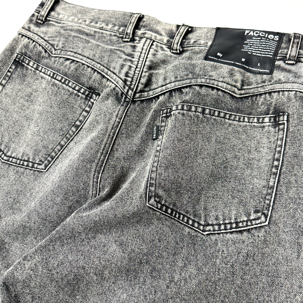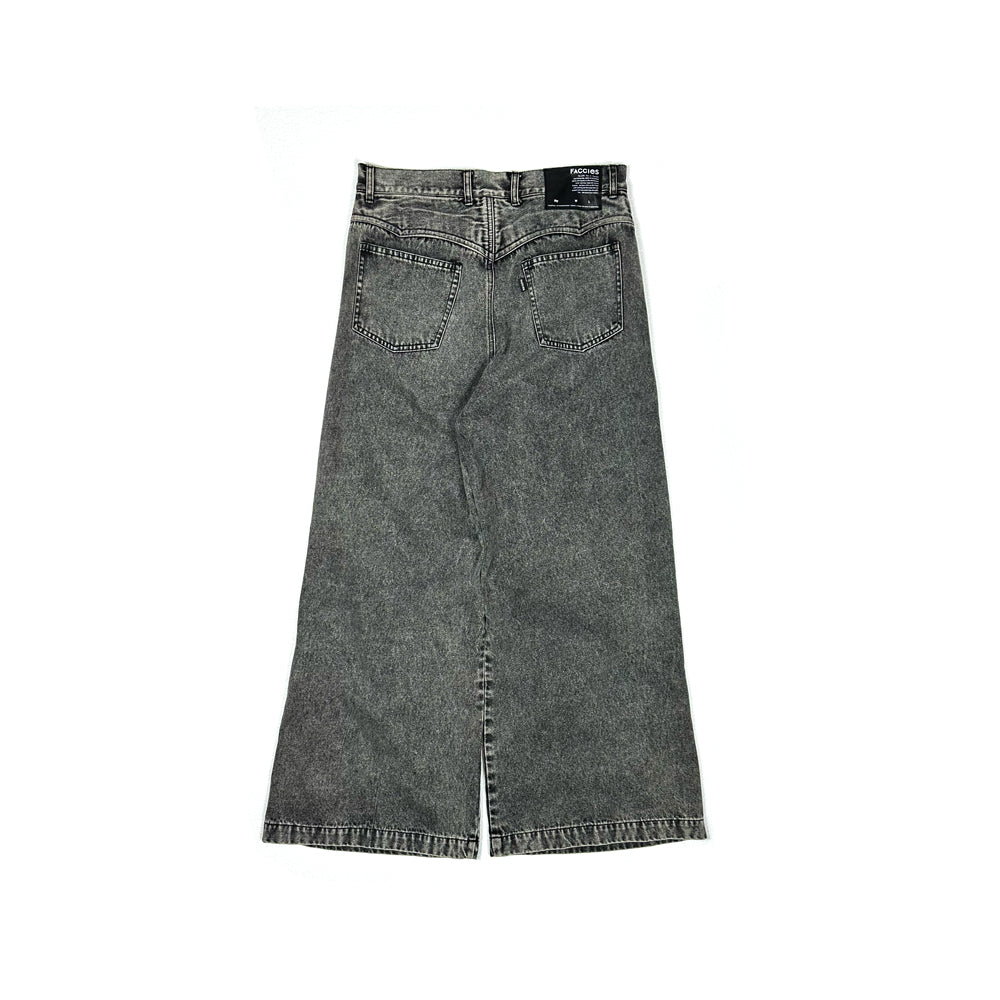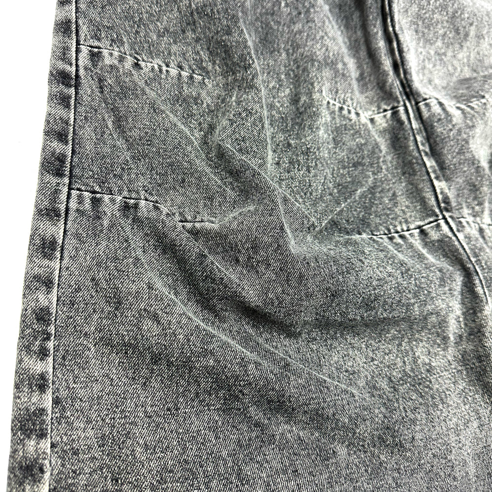 生地には11ozのBLACKデニム生地を使用。80年代に爆発的に流行ったケミカルウォッシュ(アシッド)をベースに施し、色が抜けた上からオーバーダイでさらに 色を入れて奥行きプラス。独特の色目が特徴的なデニムワイドパンツ。シルエットは裾口巾を大きめに設定したストレートタイプのパンツ。腰回りはタイトめの作りとなり野暮ったくならないように膝部分にもダーツを入れて全体的に綺麗に見えるようにパターンメイクをしている。イメージとしてはTOPSにタイトめなTシャツなどで合わせてもらえるとかっこいいかと思います。生地も11ozの厚すぎないデニム地を使用して加工処理などでクタッとさせた生地感なので夏まで着用できるように素材選定しております。
