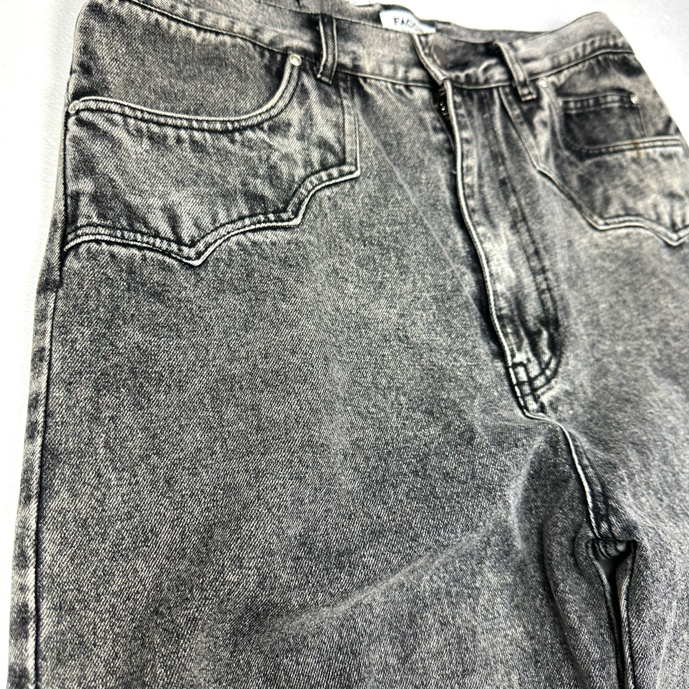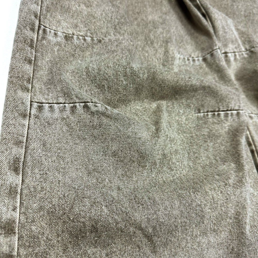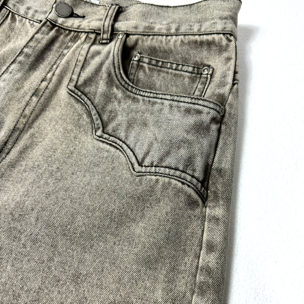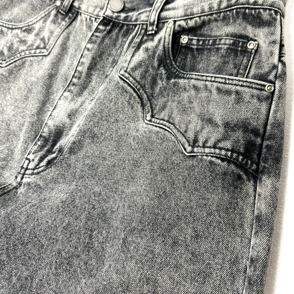生地には11ozのBLACKデニム生地を使用。80年代に爆発的に流行ったケミカルウォッシュ(アシッド)をベースに施し、色が抜けた上からオーバーダイでさらに 色を入れて奥行きプラス。独特の色目が特徴的なデニムワイドパンツ。シルエットは裾口巾を大きめに設定したストレートタイプのパンツ。腰回りはタイトめの作りとなり野暮ったくならないように膝部分にもダーツを入れて全体的に綺麗に見えるようにパターンメイクをしている。イメージとしてはTOPSにタイトめなTシャツなどで合わせてもらえるとかっこいいかと思います。生地も11ozの厚すぎないデニム地を使用して加工処理などでクタッとさせた生地感なので夏まで着用できるように素材選定しております。