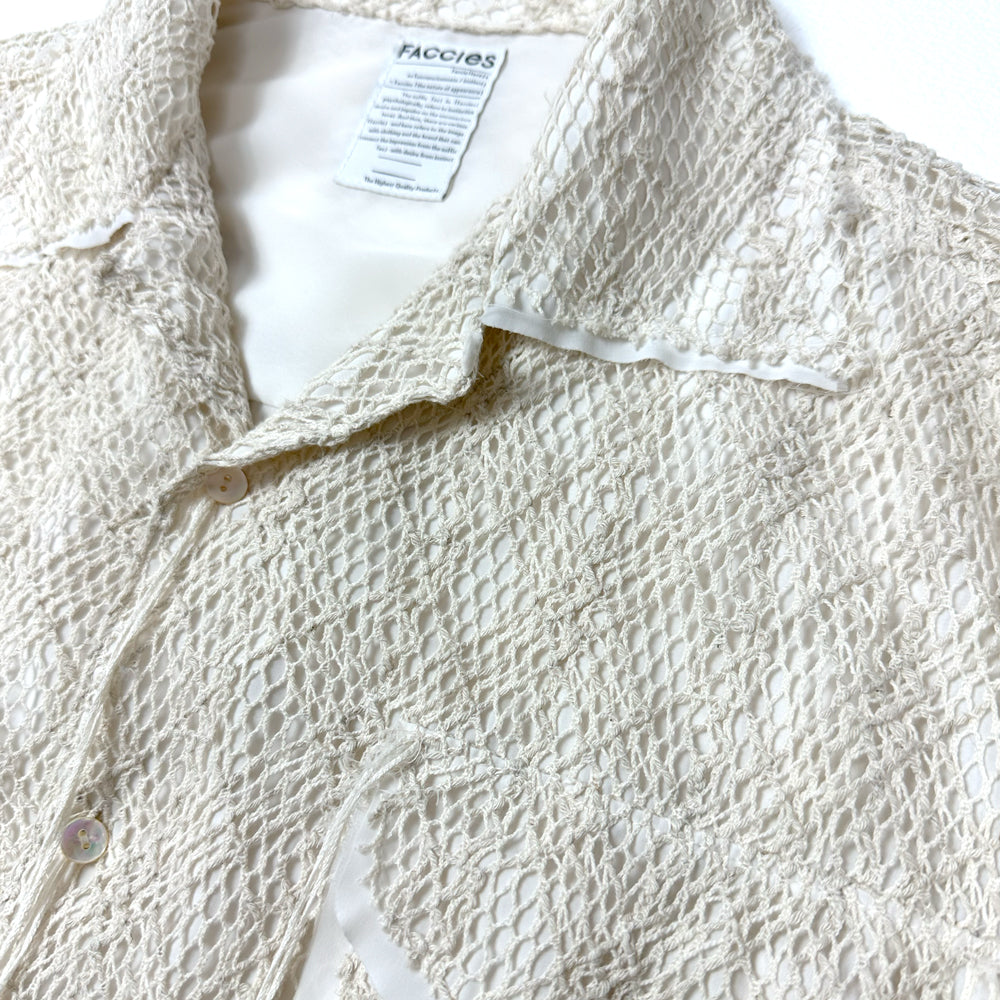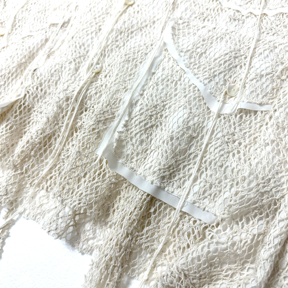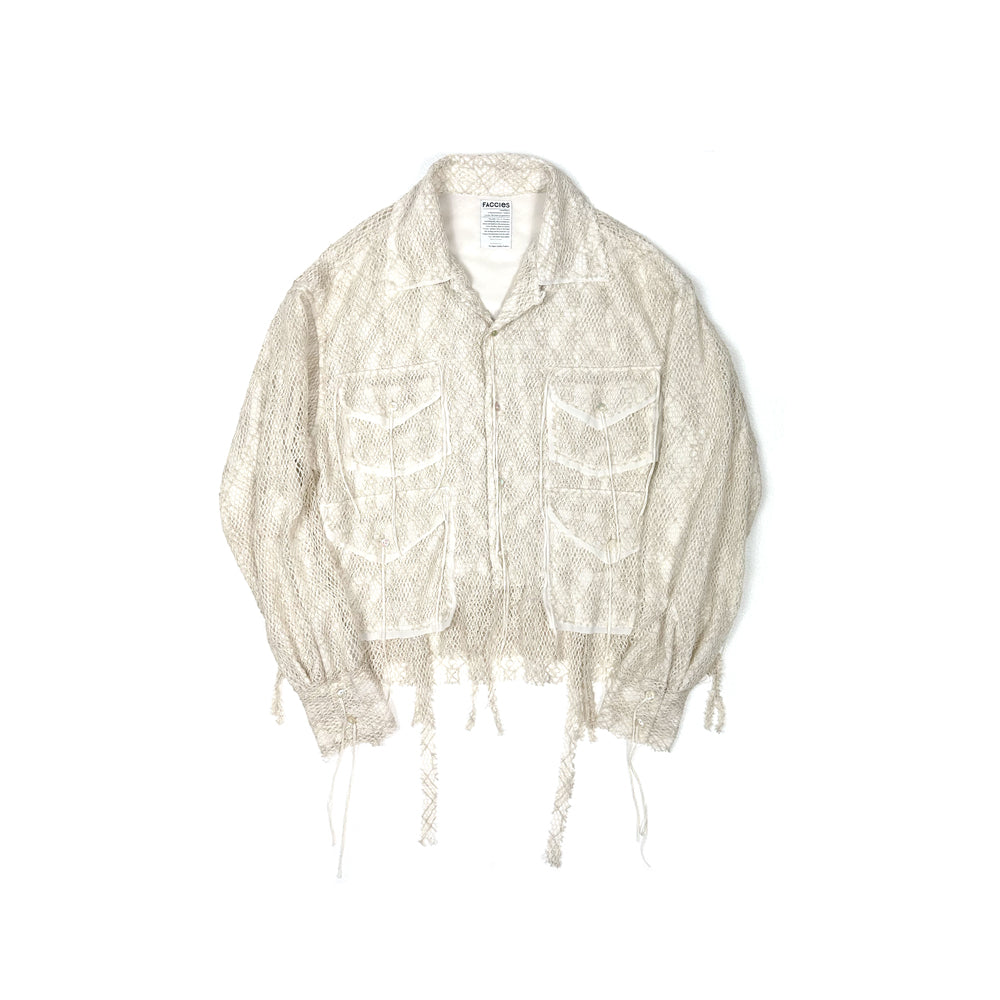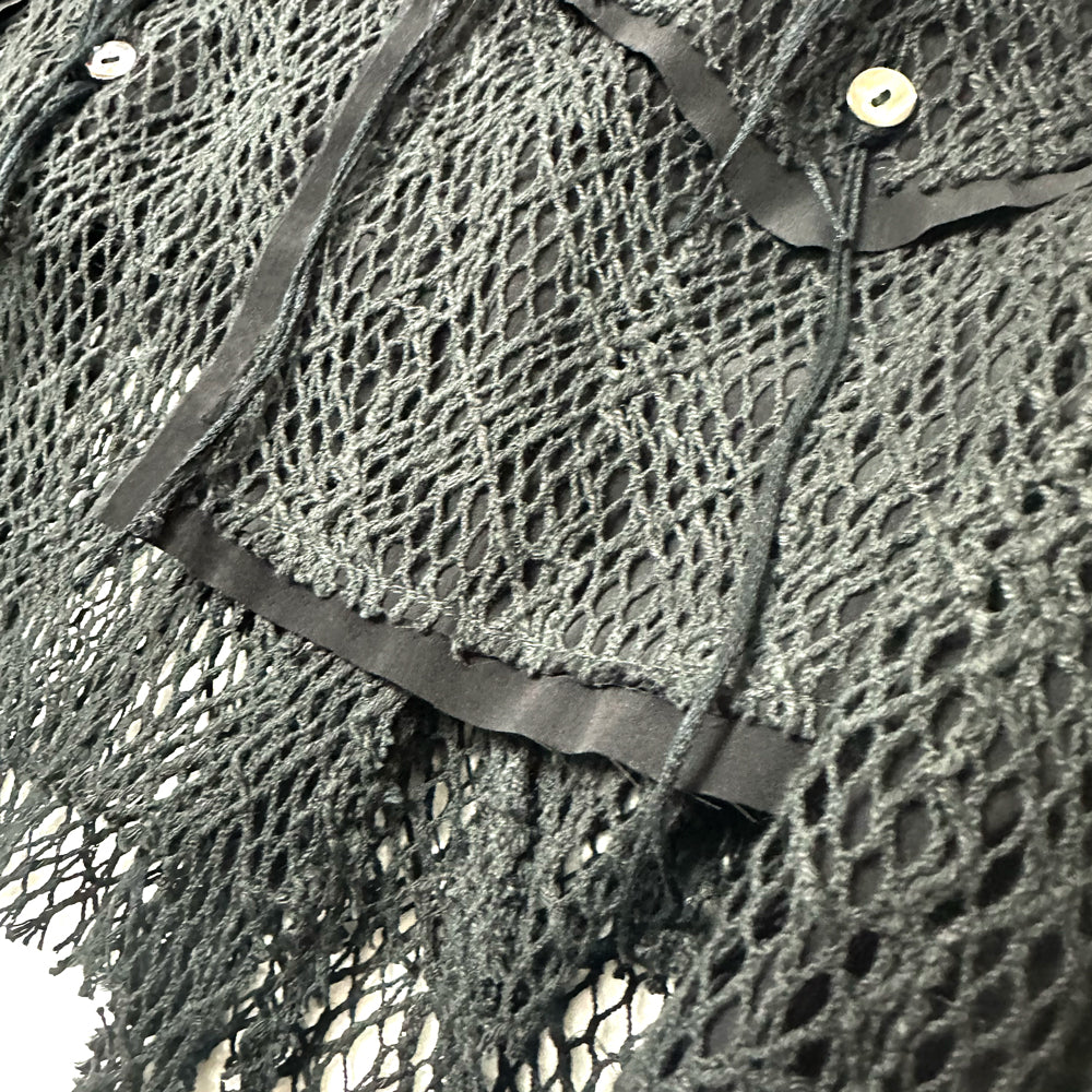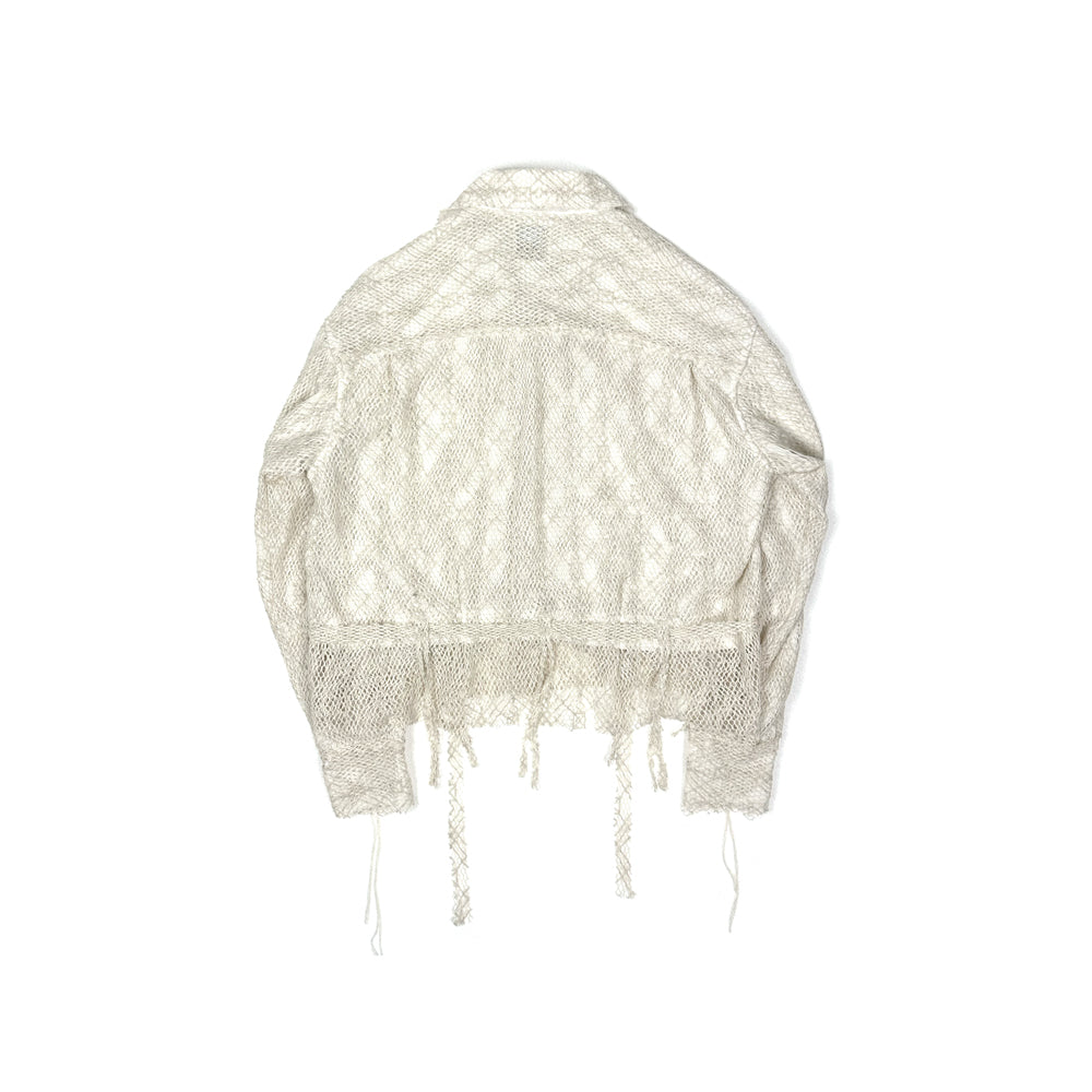 表地には太番手の糸を12GGで編んだタテ編みのクサリ編と呼ばれる組織を使用。100%天然の綿とリネンを使用してクサリ編みで編むことによりランダムでざっくりとした透け感のある素材を表現。表地の透け感を活かして裏地が表から透けて見えるようなデザインに落とし込み。着丈をショート丈に設定。シャツブルゾンのような立ち位置。1点1点職人が丁寧にメッシュ部分の断ち切りをバランスを見ながらカッティング、デコラティブな1着に仕上げました。